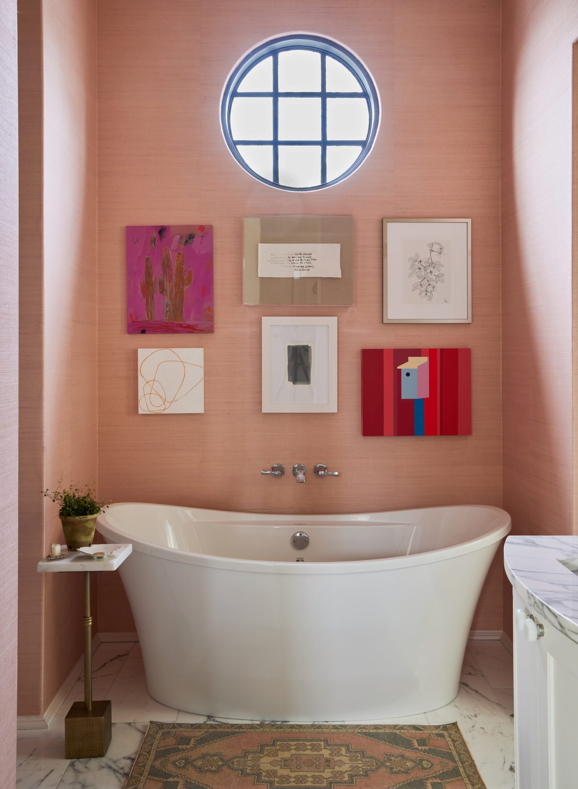 The art continues in the bathroom, where a pink grasscloth-covered wall is filled with colorful pieces sourced from Ann Connelly Fine Art. As in the rest of the home, the architectural design and details are by Jewel Centanni of Ivy Residential Concepts. Calacatta Caldia countertops from Triton Stone Group are complemented by Calacatta tile from Floor & Decor and warmed by a rug from Nashville Rug Company. The plumbing fixtures are from Ferguson, and the round window is from Moulding & Millwork Supply