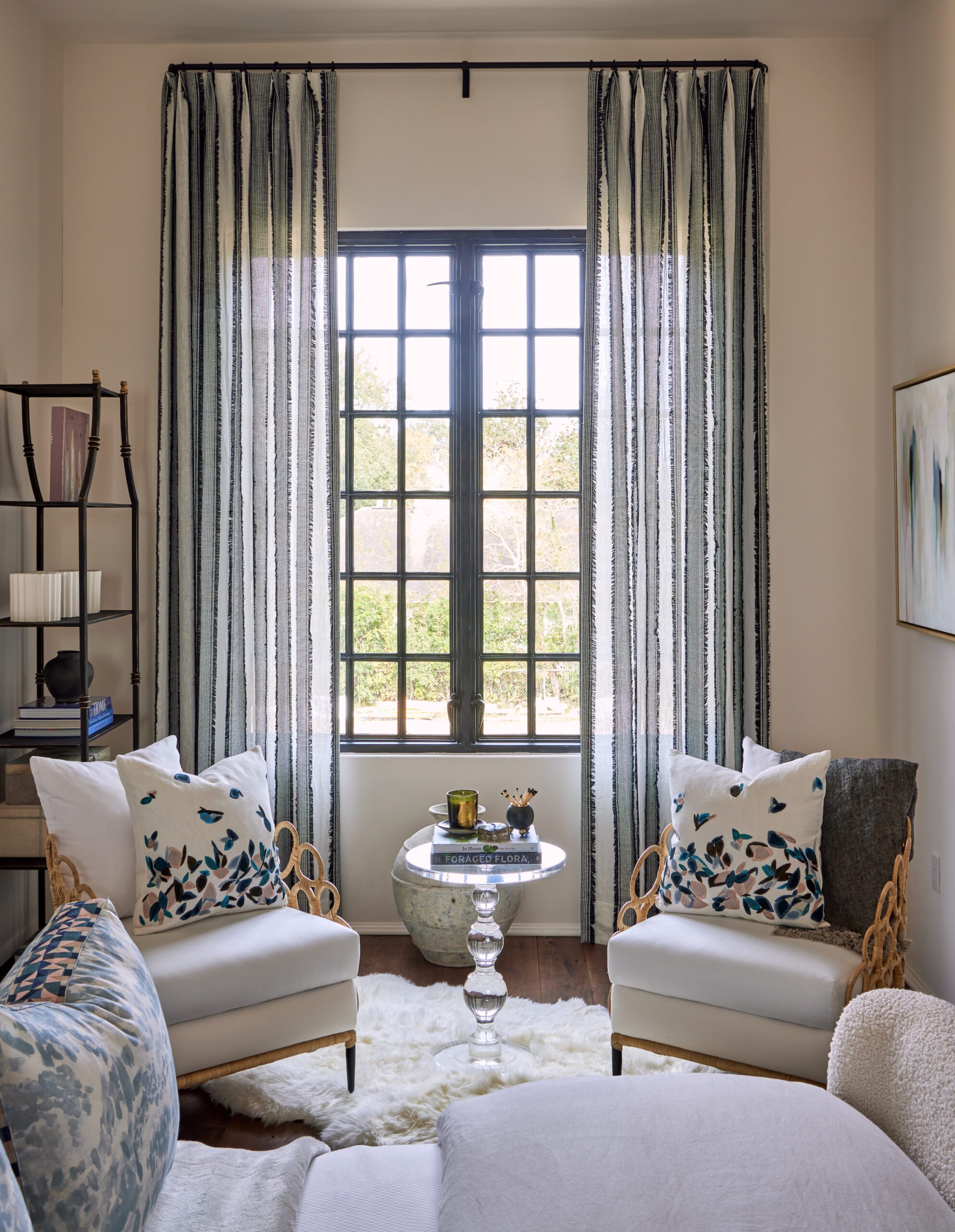 The literal and figurative centerpiece of this space is the flower-inspired pink glass light fixture by Visual Comfort. When the Design Studio team spotted it at High Point Market, they knew immediately it would be perfect for the room. “Our color palette and fabrics for all three spaces were designed around this piece, along with a custom-embroidered fabric from a textile company based in London,” says Girouard.