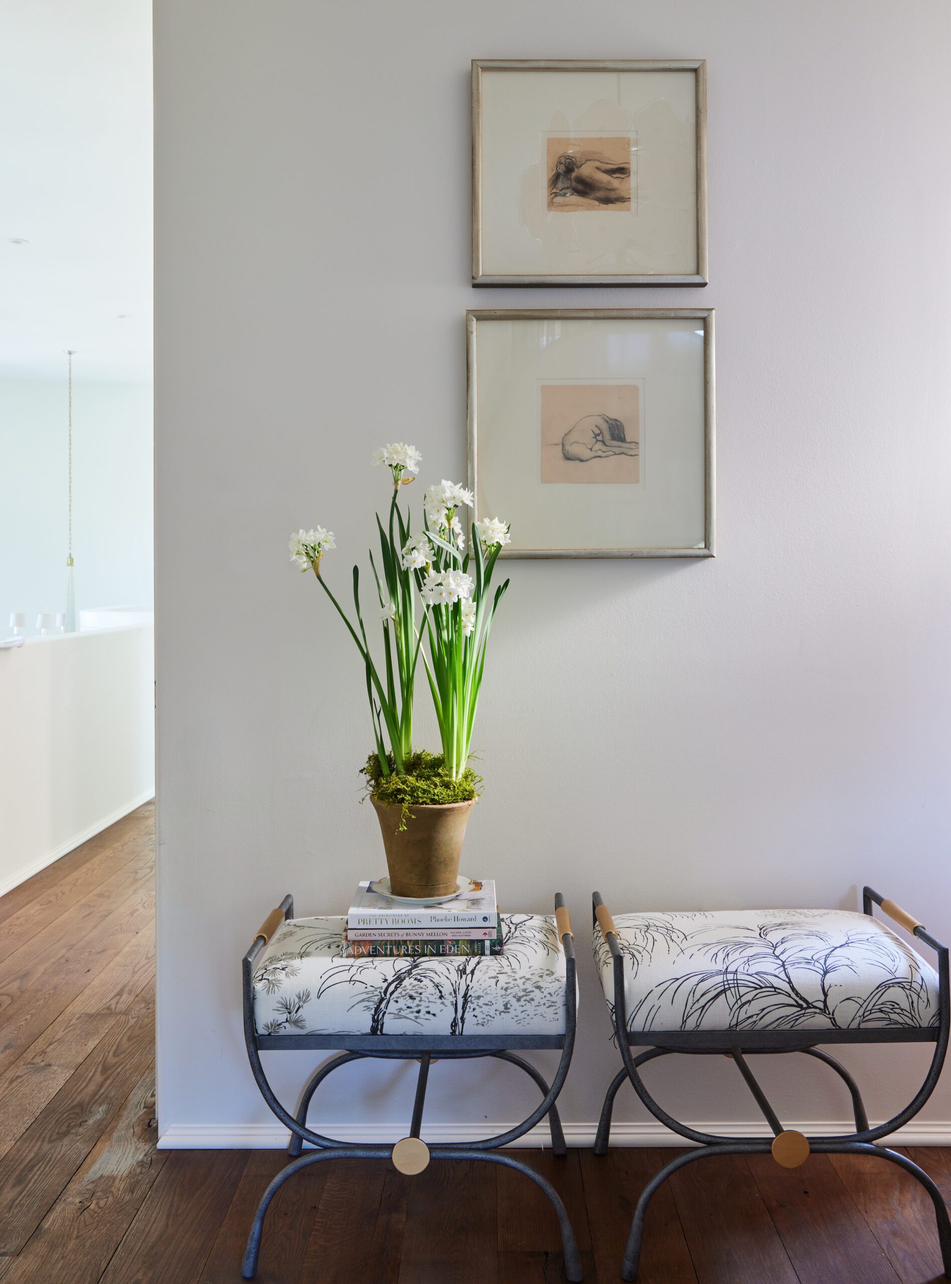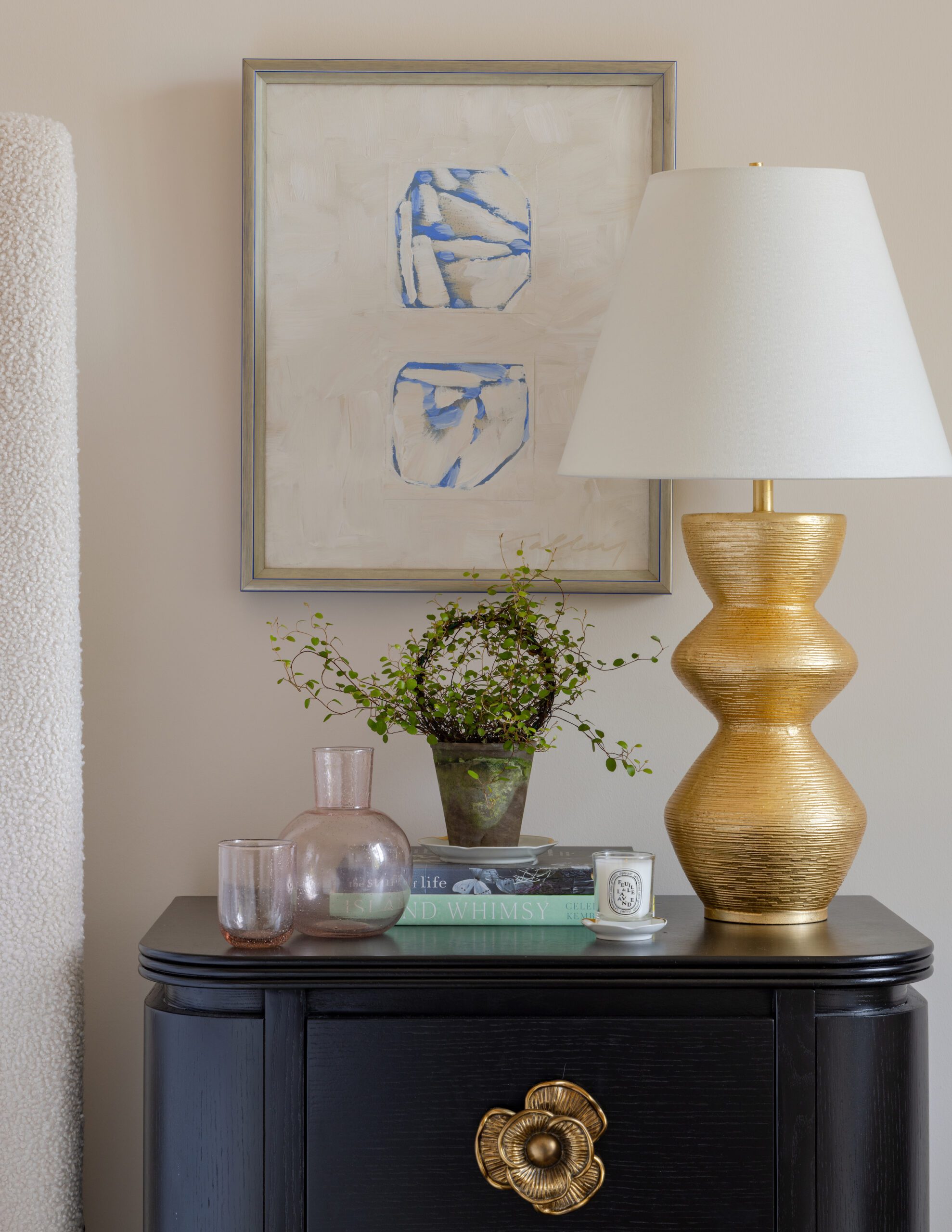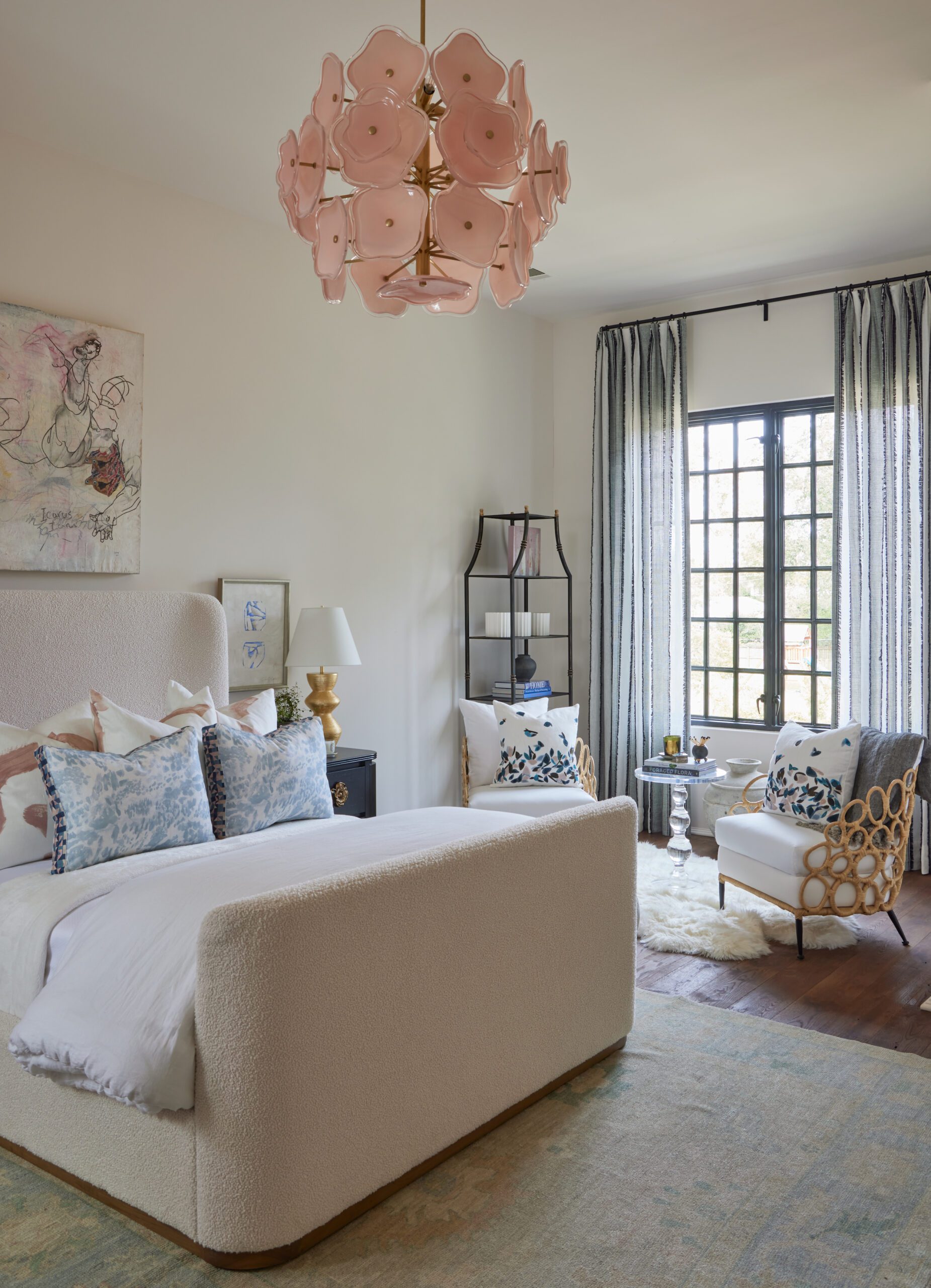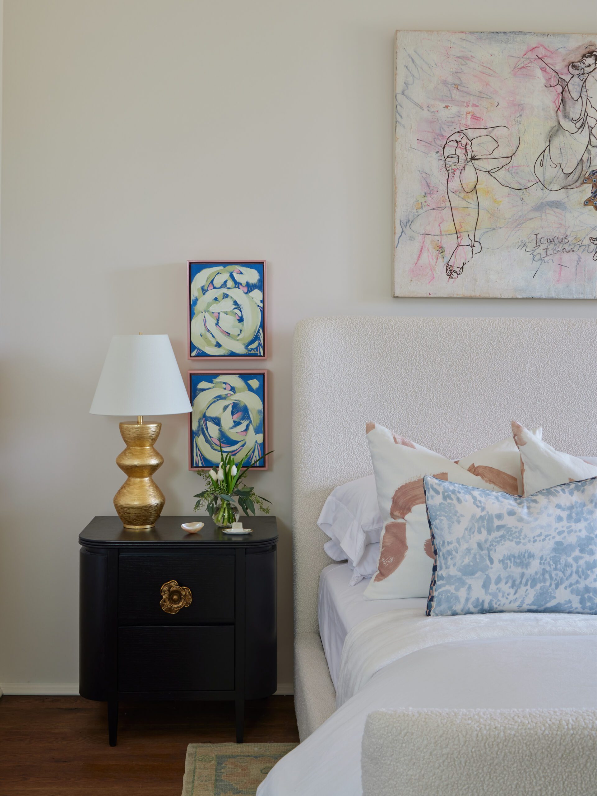Applied to throw pillows by Kathy Rath, the unique fabric adds a pop of pattern atop a curvaceous custom boucle-upholstered bed. Over the bed hangs a painting by Demond Matsuo from Ann Connelly Fine Art, and the space also features artworks by Amanda Stone Talley and Jessica McHugh.