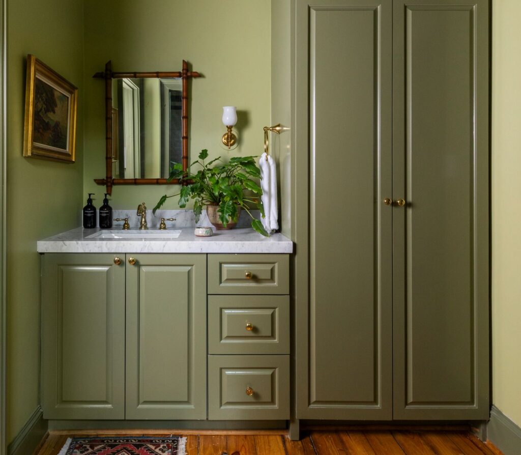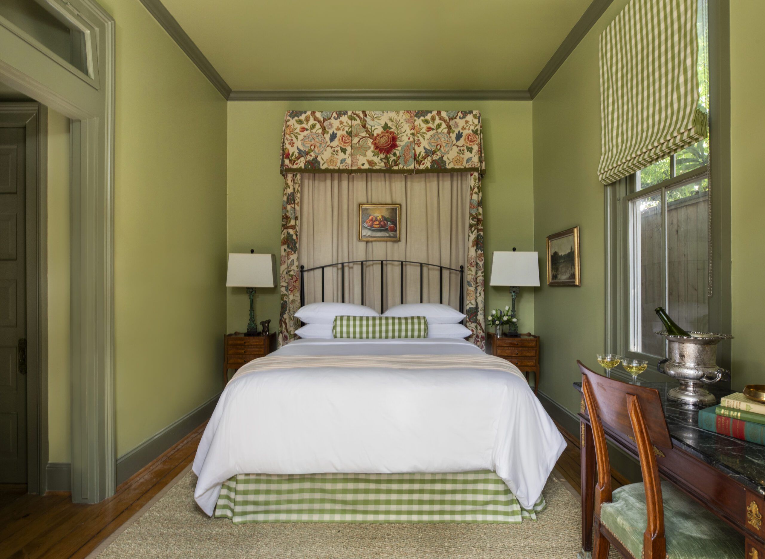 The cottage is grounded by green hues inspired by the garden just outside its doors. With green walls, bedding, and earthy elements throughout, the space is truly a continuation of the surrounding landscape.