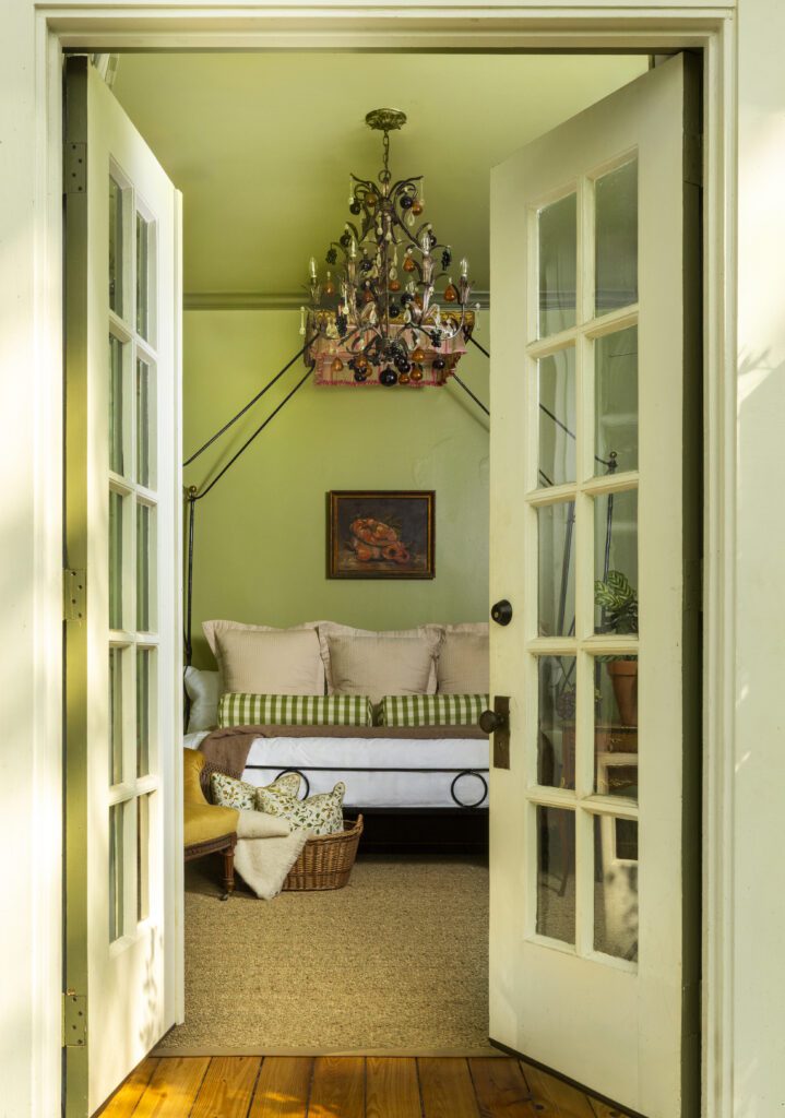 Pops of green gingham fabric on the pillows, bed skirt and drapes embrace the cottagecore aesthetic while gilded antique pieces offer a chic balance of playfulness and luxury. A highlight of Tracie’s Cottage is the large, blown-glass fruit chandelier.