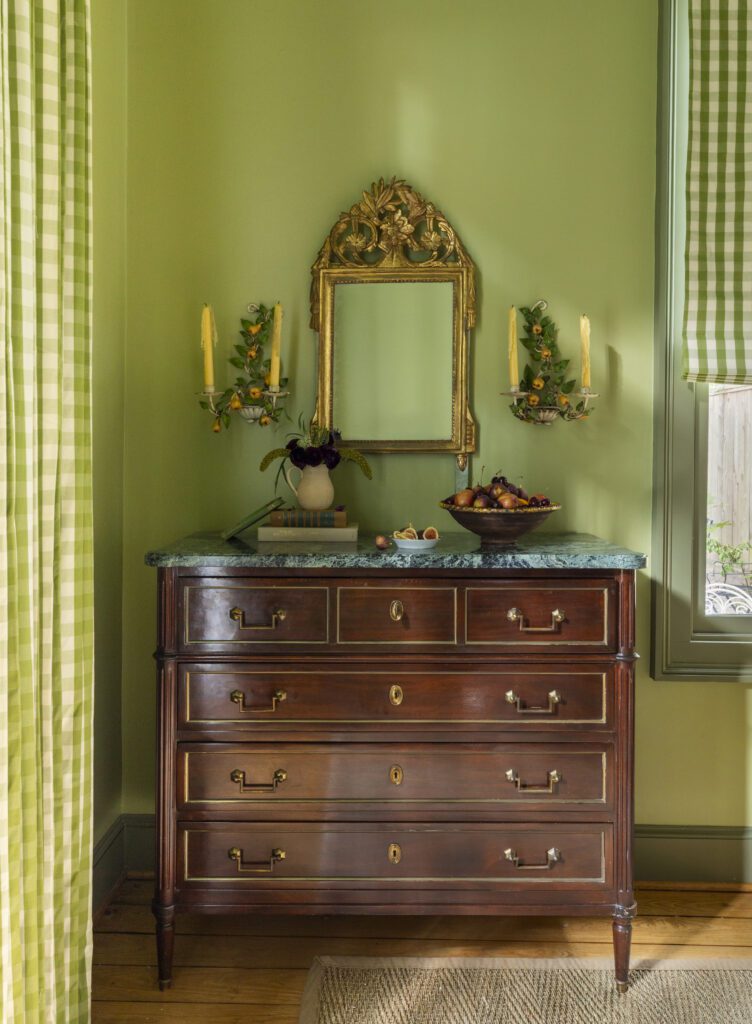 A French antique still-life painting of peaches hangs above the bed, a standout element of the room. It also serves as another nod to its namesake. “My mom always said she wanted her grandkids to one day call her ‘Peaches,'” Barfield says.