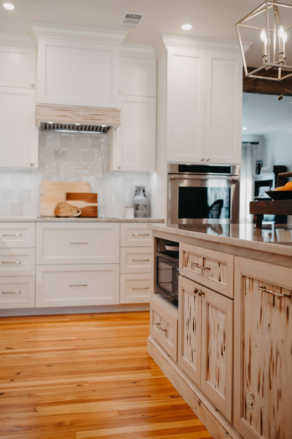 Recycled materials also present a solution to the ever-present goal of increased sustainability in the realm of architecture and design. In a separate renovation project, Cedor took down pecky cypress wall wainscoting that was wrapped throughout the home and refurbished a few of the pieces to serve as the wood for the kitchen hood and island.
