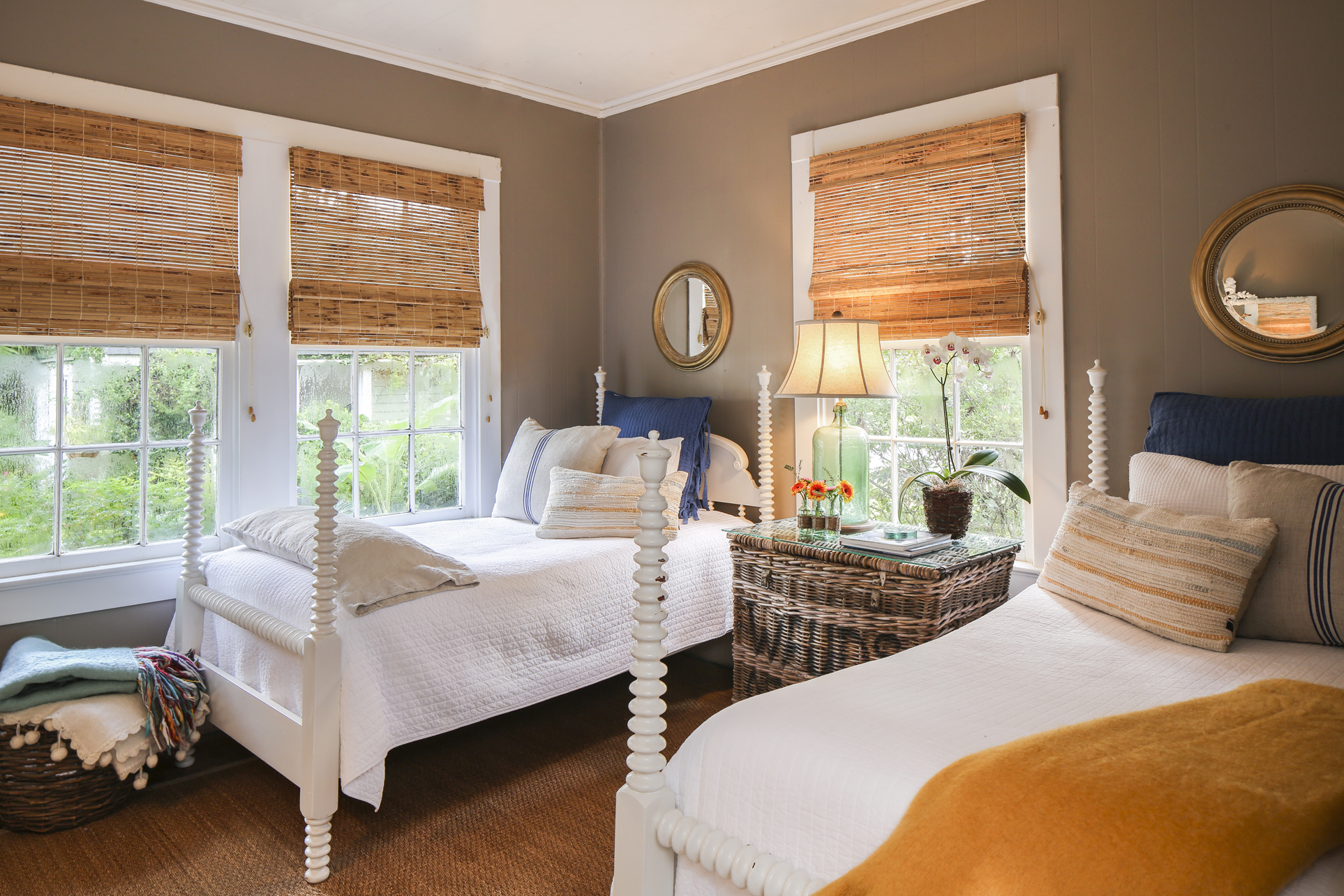 Her affinity for white is not only realized in painted furniture but in the slipcover penchant she shares with Rachel and their other sister, Julie Bergeron. Most soft goods in the house are covered with white cotton canvas slipcovers and accented with colorful pillows. Antique rugs, woven baskets, sea grass floor coverings, and old weathered shutters add additional texture to the interiors, but it’s the slipcovered furniture in this cottage that gives it cohesive charm.