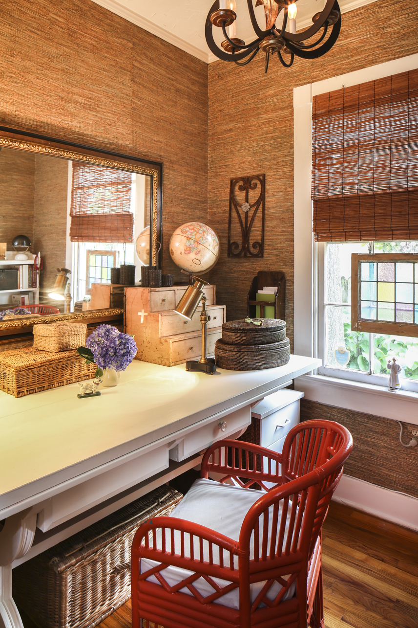 Ruthie has mixed her own vintage items—an old cabinet from a bank that serves as the dining room buffet, an Australian trunk that works double time as storage and a coffee table—with oversized furniture, favorite books and found art. She likes mixing old and new, formal and informal, period antiques with estate sale finds. And she relishes the discovery of furnishings with no sticker shock.