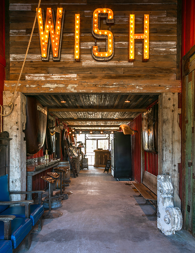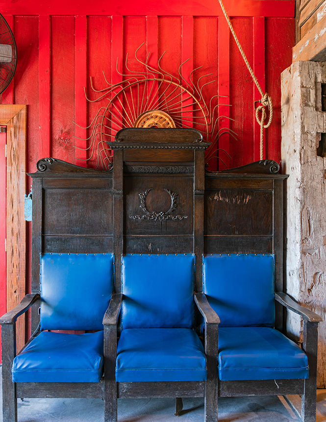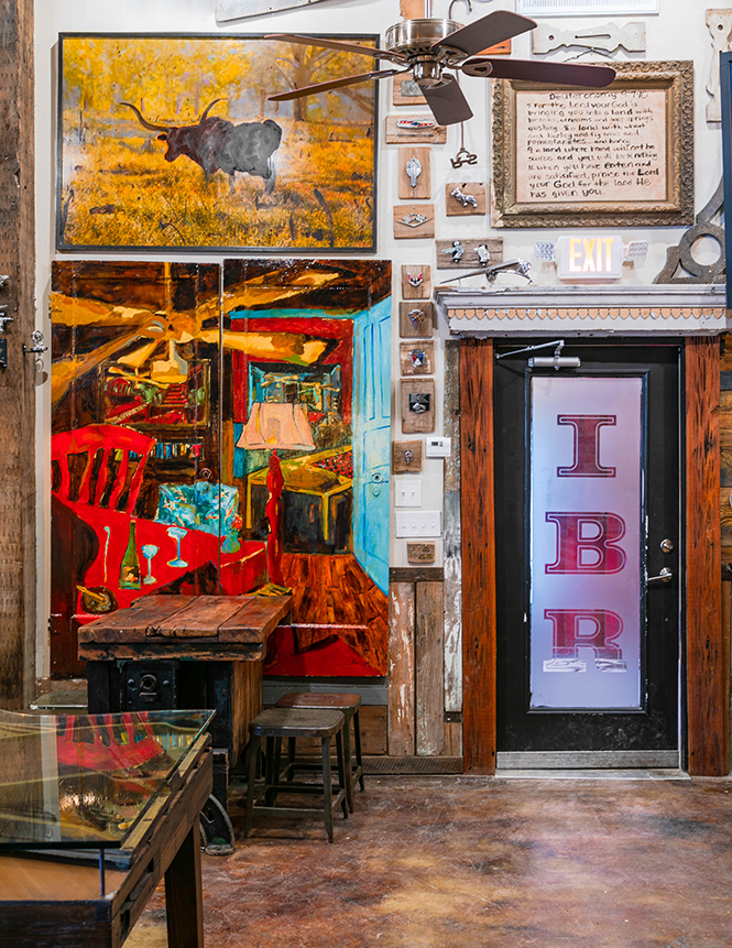 But once inside the barn, visitors quickly realize that they haven’t escaped to a typical rustic locale. John’s vivid paintings are matched with found items that they’ve had refurbished, other art and collectibles, plus unique treasures that hold their own stories. A 10-foot-long stuffed alligator caught by John and their sons is mounted on cypress and holds court above the bar. Barbershop chairs from the 1930s serve as seating, tables are made from pianos, and light fixtures include one crafted from a trombone. Old trucks reign supreme in this scene: A 1950 Chevy was made into seating, a 1952 Ford was cut in half and put on the wall to serve beer, and old car and truck headlights can be found hanging overhead casting new light through old lenses.