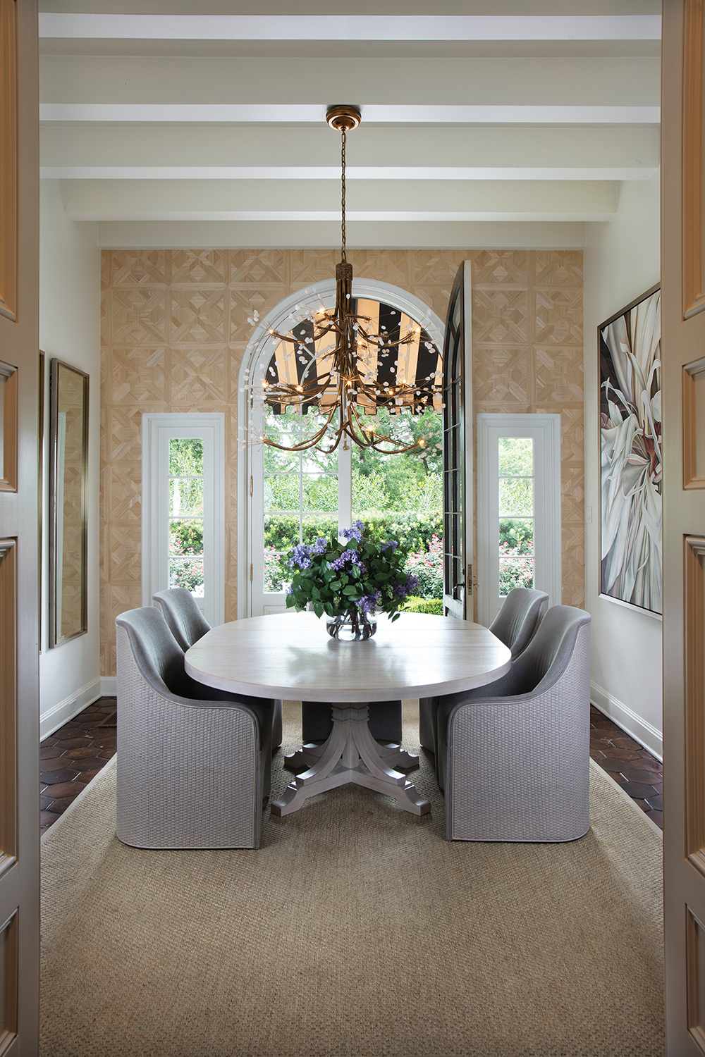 The couple’s underlying classic style helped steer the project in the right direction, given the formal nature of the home, with its intricate woodwork, lofty ceilings and sprawling floorplan. But Breaux says her job was to help her clients push the envelope and opt for edgier, statement-making pieces that juxtapose with the home’s style. Outside-the-box chairs were chosen for the head of the formal dining table and covered in Italian fabric sourced during one of Breaux’s trips to Manhattan. A starburst chandelier dangles from the ceiling of the casual living room space. And, perhaps most importantly, bold artworks are scattered throughout the home. “Art really is the ribbon tied around this project,” Breaux notes.