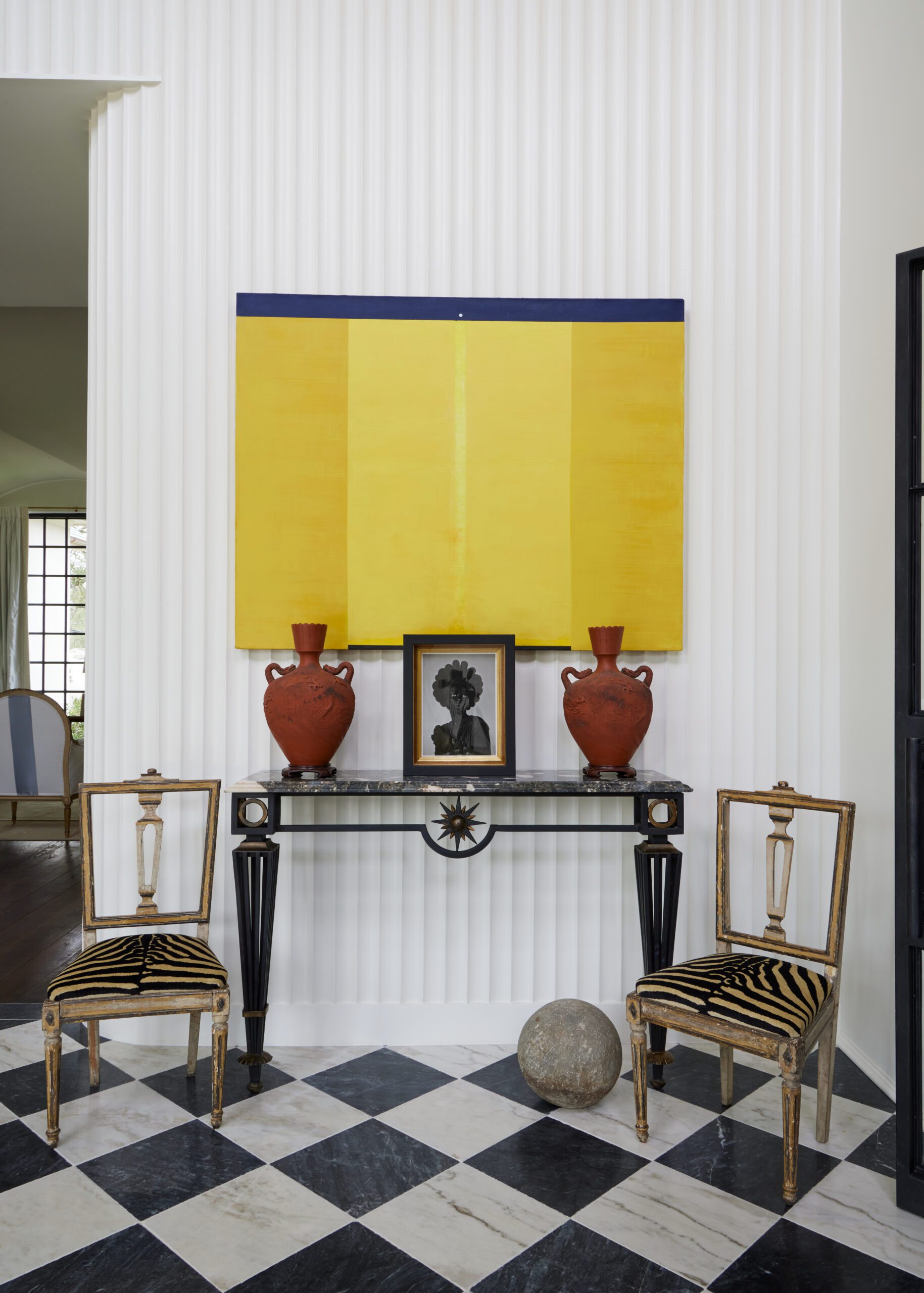 Since limited furniture is needed in a foyer, McDaniel made the most impact through a selection of artworks. A large yellow expressionist piece by Ed Pramuk, whose work McDaniel first saw on display at LSU in the 1980s, was sourced with the help of Ann Connelly Fine Art. Titled “Portal Flare,” the piece brings a dose of color to the space and helps to translate McDaniel’s vision of a bright, post-COVID world. To juxtapose the minimalist work, portraits in a range of styles are dotted throughout the space. Immediately below the Pramuk work, atop an iron and marble console table in the style of Gilbert Poillerat, is a black-and-white photo by South African visual artist Zanele Muholi. Across the room, an oversized bust of the Sun King is framed by the staircase, while an early Flemish portrait of a boy is suspended from a medallion and chains in the stairwell.