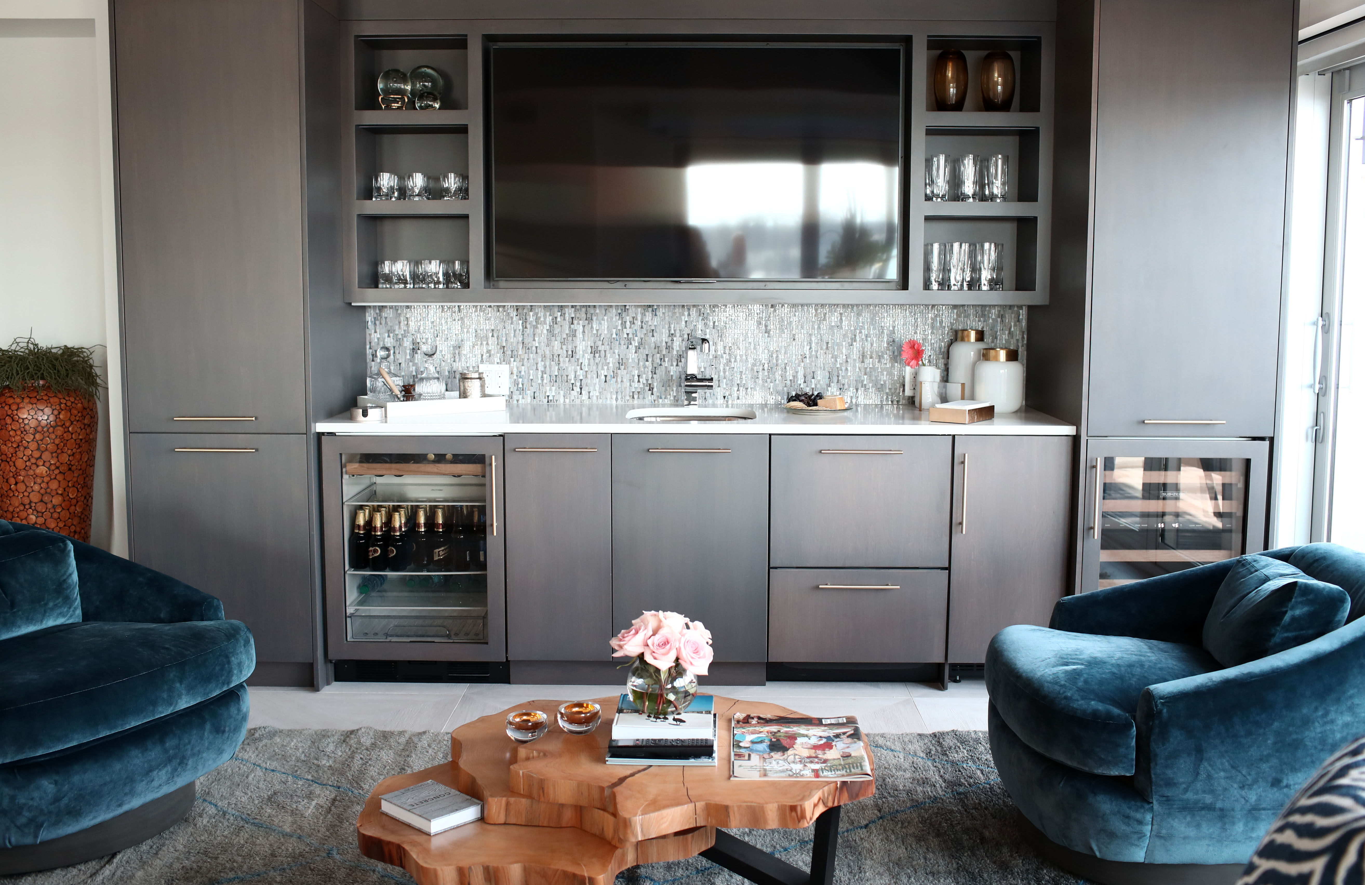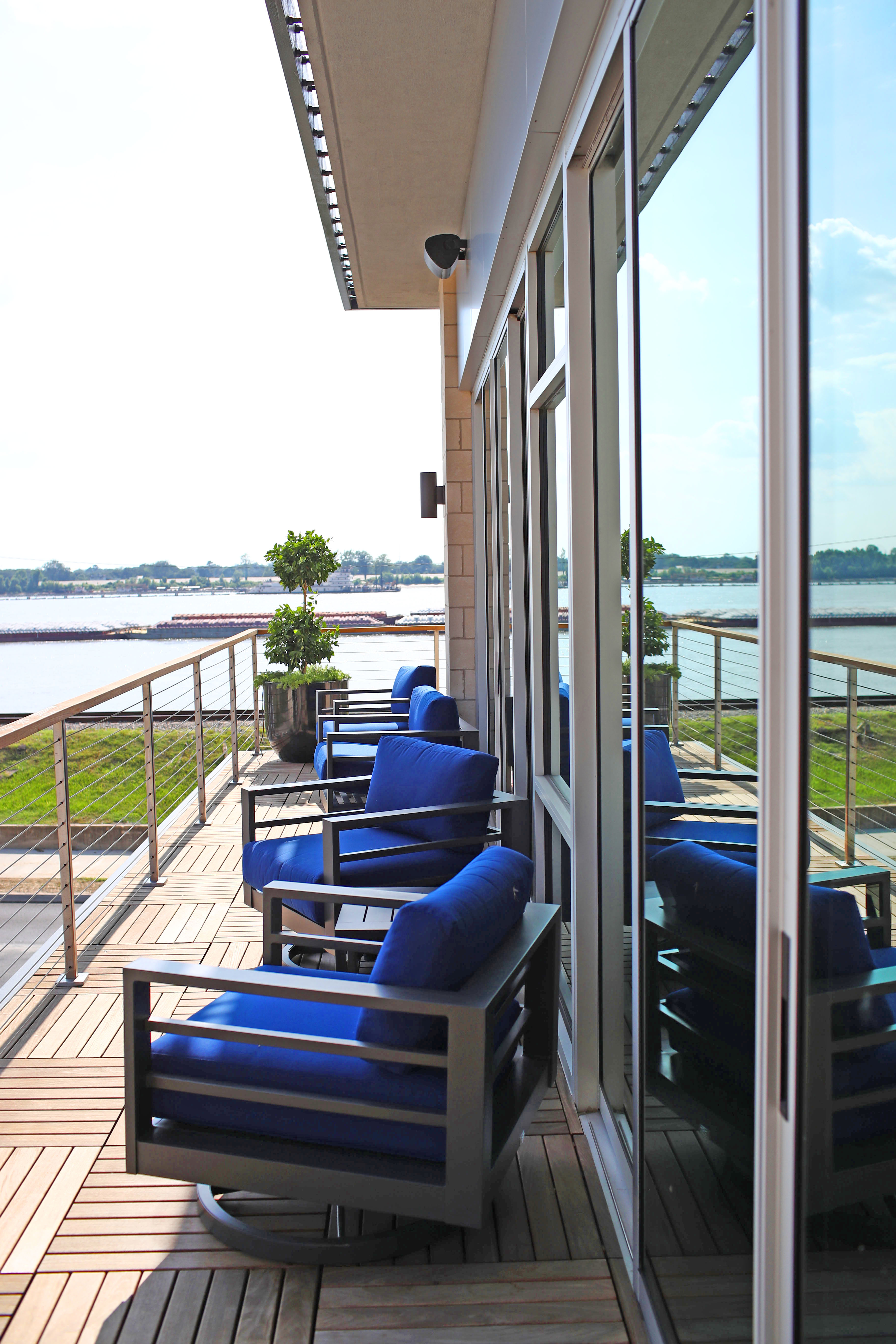 “Marty and John are very outdoorsy. They go offshore fishing a lot on their yacht, so we wanted to reflect a bit of their love of the water in this urban space,” says Becky. “The home interiors are very neutral, but we’ve introduced the accent color blue throughout to give it a punch of color without competing with the view of the Mississippi beyond.”