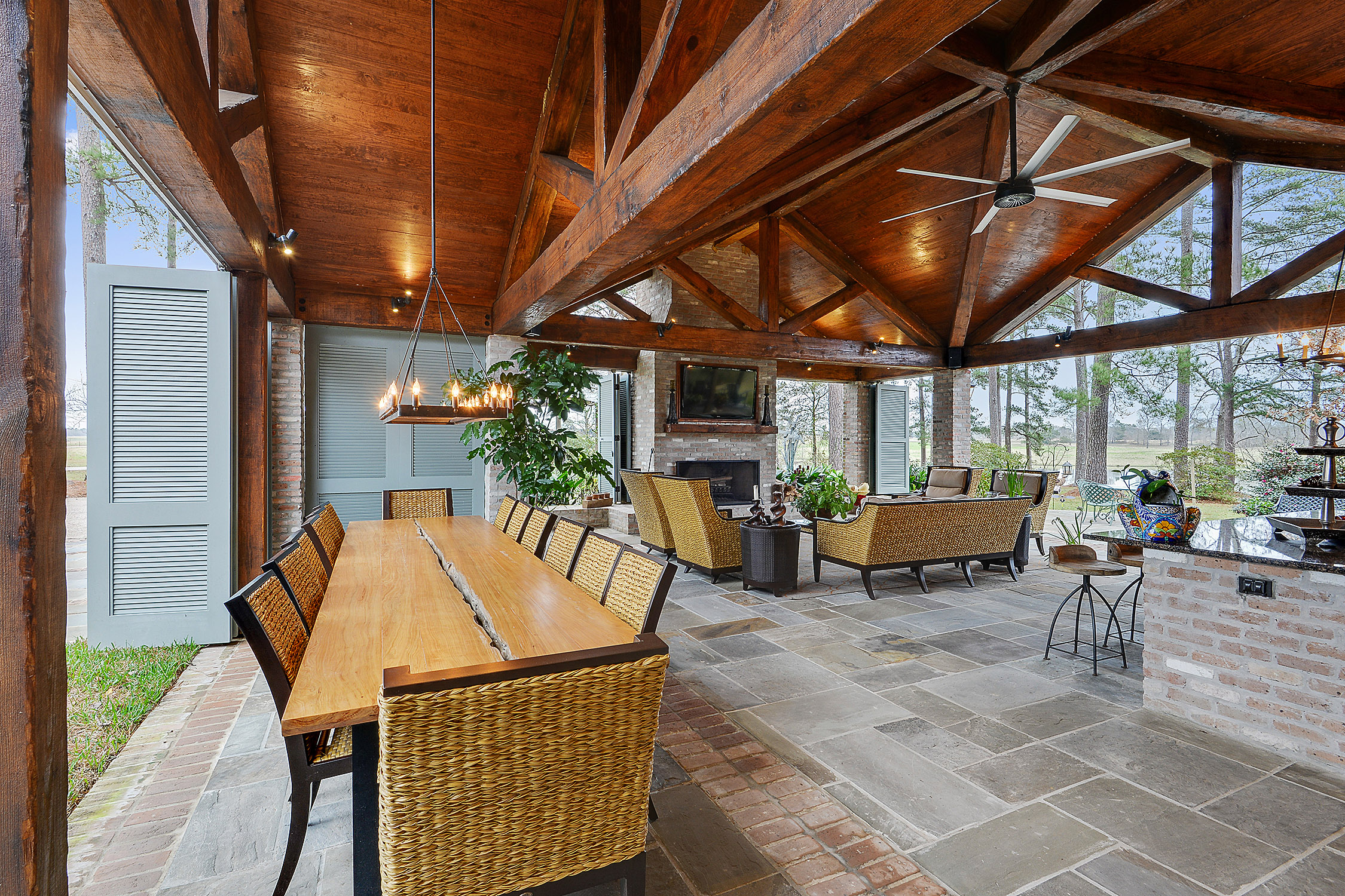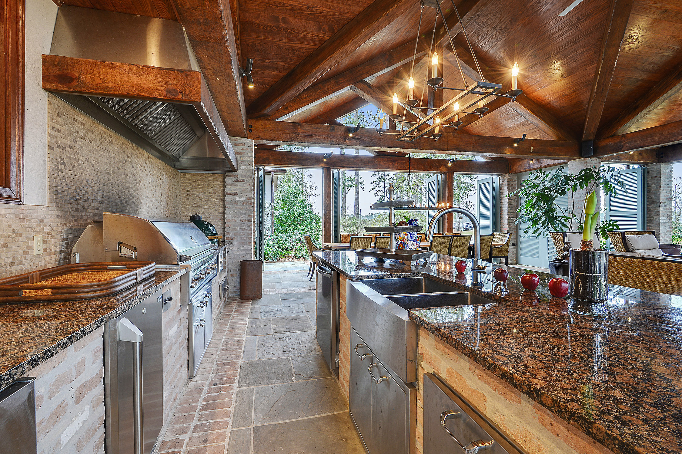 Indeed, one of the most spectacular elements of the ranch house is its new outdoor kitchen and living area designed by architect Lionel Bailey. More than 50 distressed antique beams were used in its construction, creating vaulted ceilings that expand the space. Slate and bricks line the floors, and a full commercial-grade kitchen was installed along with an outdoor fireplace. And much like their turn-key closure of their downtown home, oversized shutters can be secured to completely close off the outdoor kitchen from the elements.