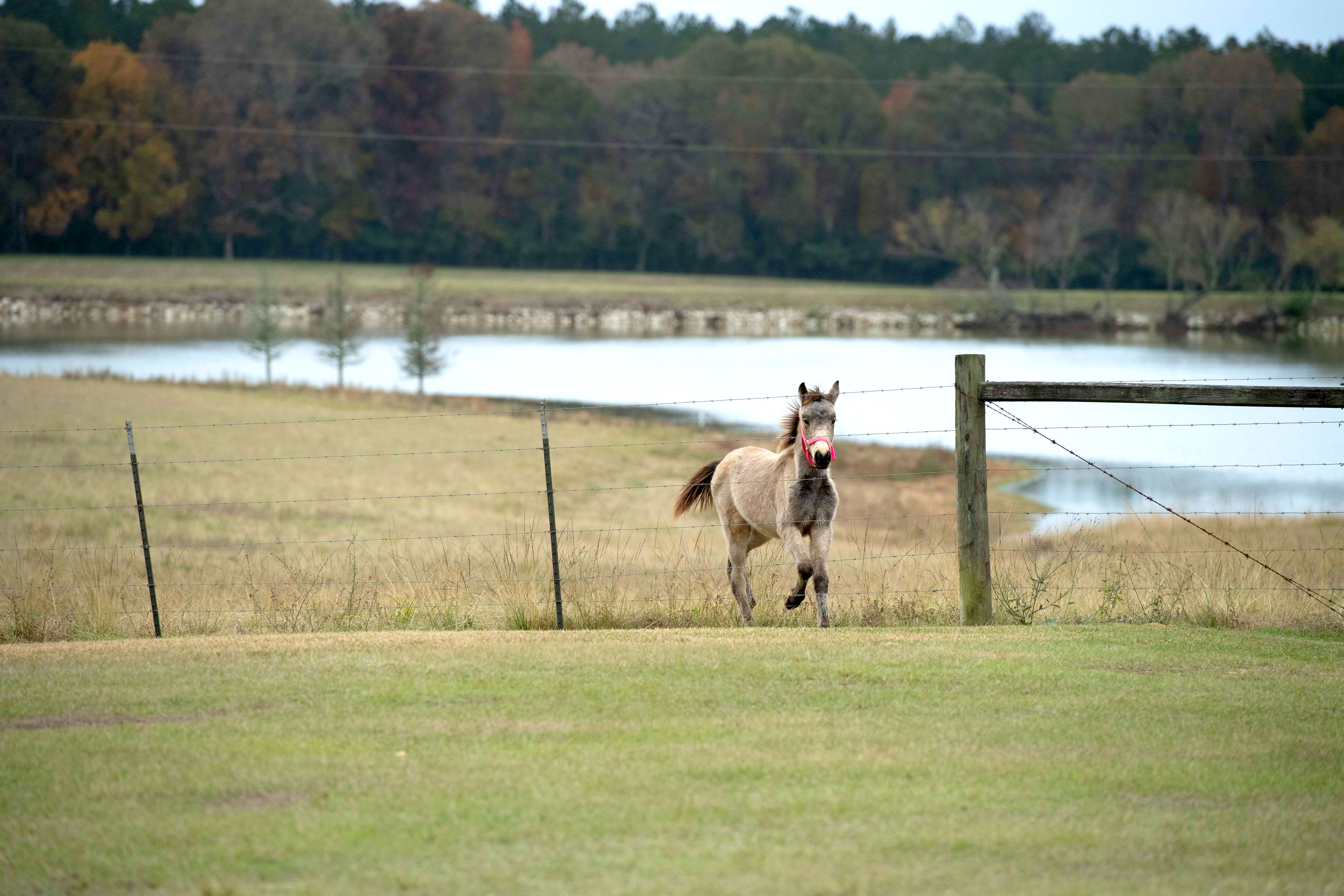 The filly whinnies at the gate, shakes her head, then turns and gallops off, circling a tree in the expansive pasture before kicking up her heels in her return to the fence. She is spirited. She is happy. She is home.