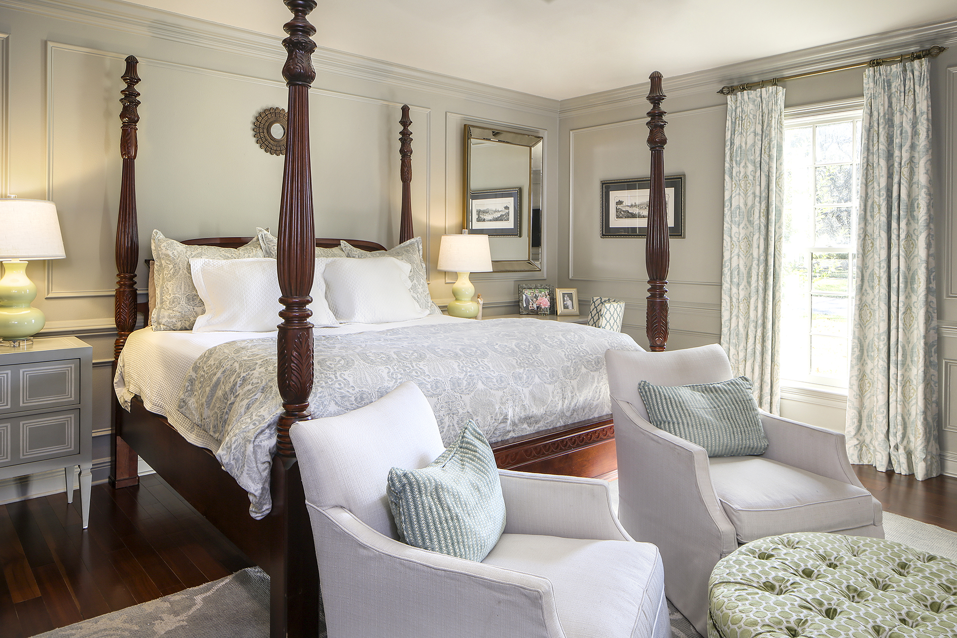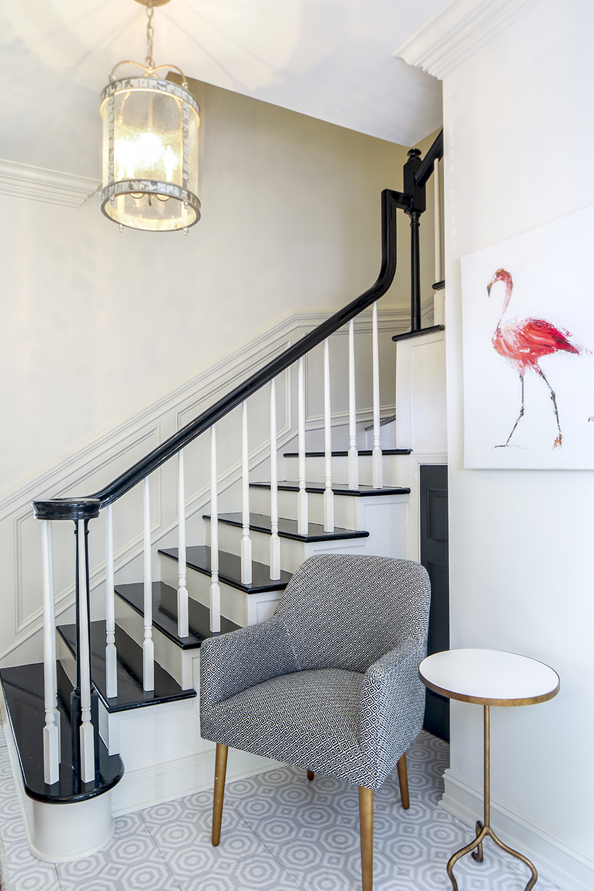 This commitment to standing out starts at the home’s exterior. After much debate, Sean and Lana opted to leave the home’s red brick façade untouched by ever-popular white paint. “I think the natural brick gives such a stately look,” says Lana. To top it off, Brignac talked the couple into washing their front door in one of her favorite hues: “Terrapin Green” by Benjamin Moore.