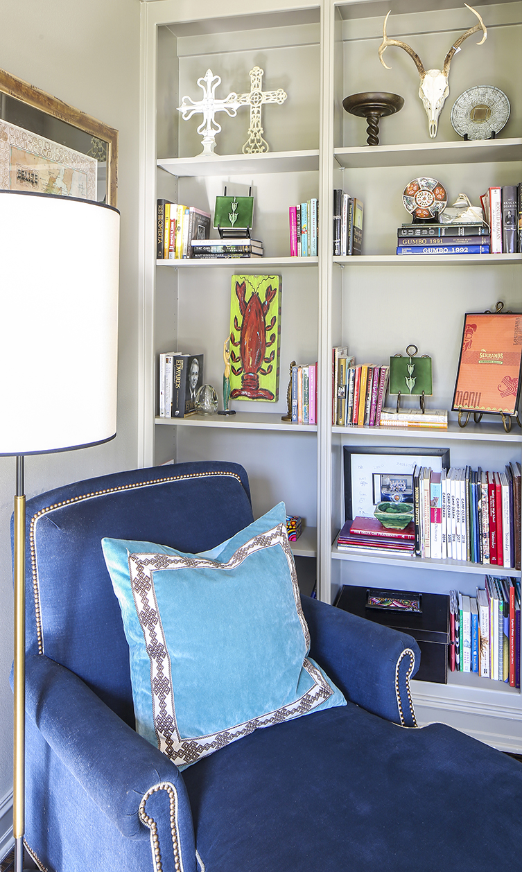 In order to keep with the style of the house while staying true to the Malones’ vibrant personality, Brignac focused on bringing together a mixture of the traditional and the unexpected. In the entry, hand-blocked wood floor tiles from North Carolina’s Mirth Studios in a gray-and-white geometric pattern offer a modern take on parquet flooring and play off of the black painted stairs and rail. In the adjacent homework and play space, an antique French table from The Royal Standard brings warmth against the cool tone of Benjamin Moore’s “Rockport Gray,” in which both the built-in bookshelves and walls are washed. “I don’t know how, but it all works,” says Lana.