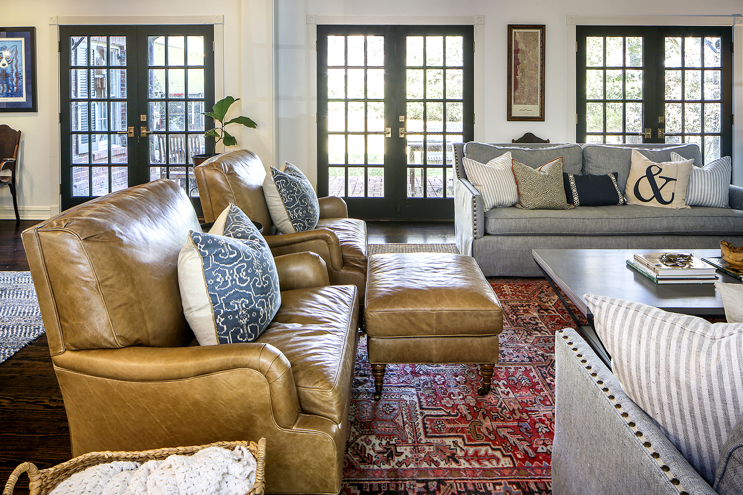 Before the Malones moved in, they added bookcases to the sides of the main living room’s mantel to provide a space for displaying family photos and collected pieces. Atop dark stained wood floors, layered rugs give a casual and comfortable feel while tying in the bold colors of Sean and Lana’s framed Jazz Fest posters.