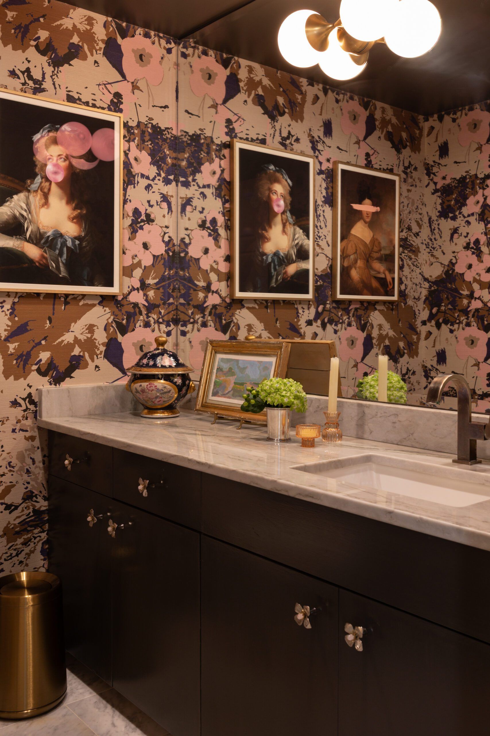 Inspired by the chocolate-colored office Trent’s client had previously redesigned down the hall, Trent doused the ceiling and cabinetry in the powder bath with a dark urbane bronze paint and wrapped the walls in a graphic pink, gold and brown floral wallpaper. Pops of mid-century modern fixtures and cheeky artwork push the envelope even further, making it hard to believe the room or the home it resides in had ever been white-washed or conventional.