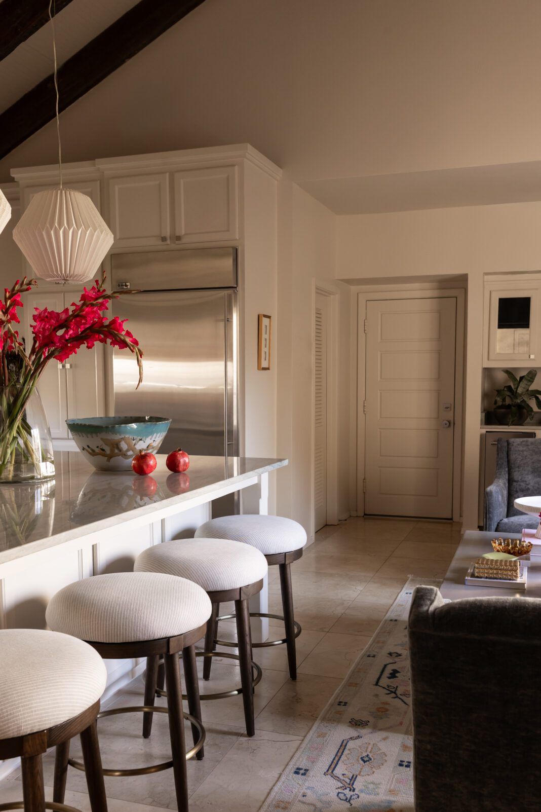 Trent replaced a wicker bench under the picture window, known to be the most uncomfortable spot in the house, with a long, upholstered banquette and flanked it with blue velvet swivel chairs the couple had previously purchased. Cushioned, rotating bar stools were added at the island across from the seating area, encouraging connection among kitchen and keeping room dwellers and helping to accommodate the whole family in the heart of the home.