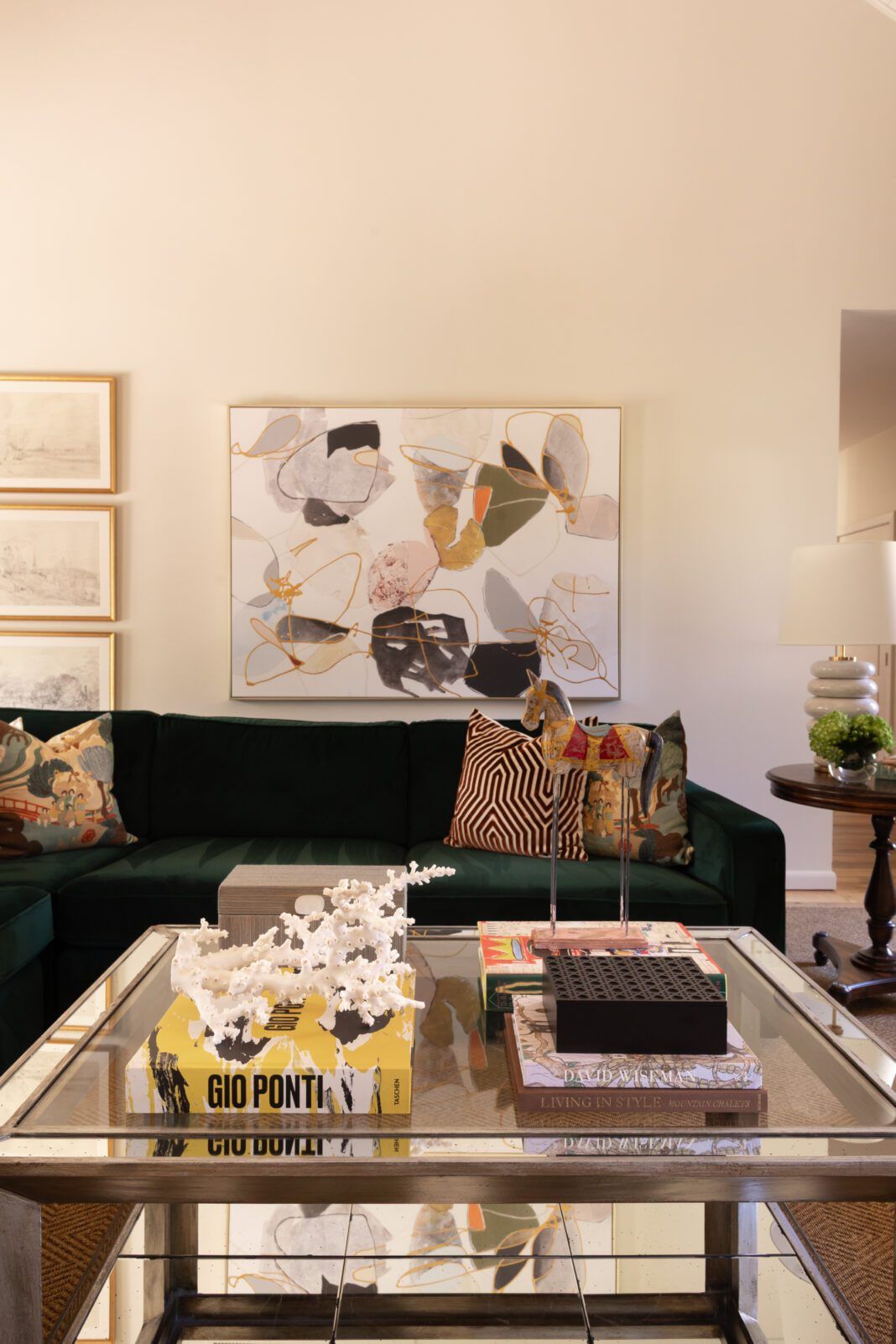 The living room was a point of contention. Spacious but largely unused, the couple wanted the space to be more welcoming for their growing brood. The all-white furniture would have to go to welcome grubby hands prone to spills. Trent replaced the cream sofas with a giant emerald green sectional, great for gatherings and more reflective of the fun, lively times the couple shares with family and friends.