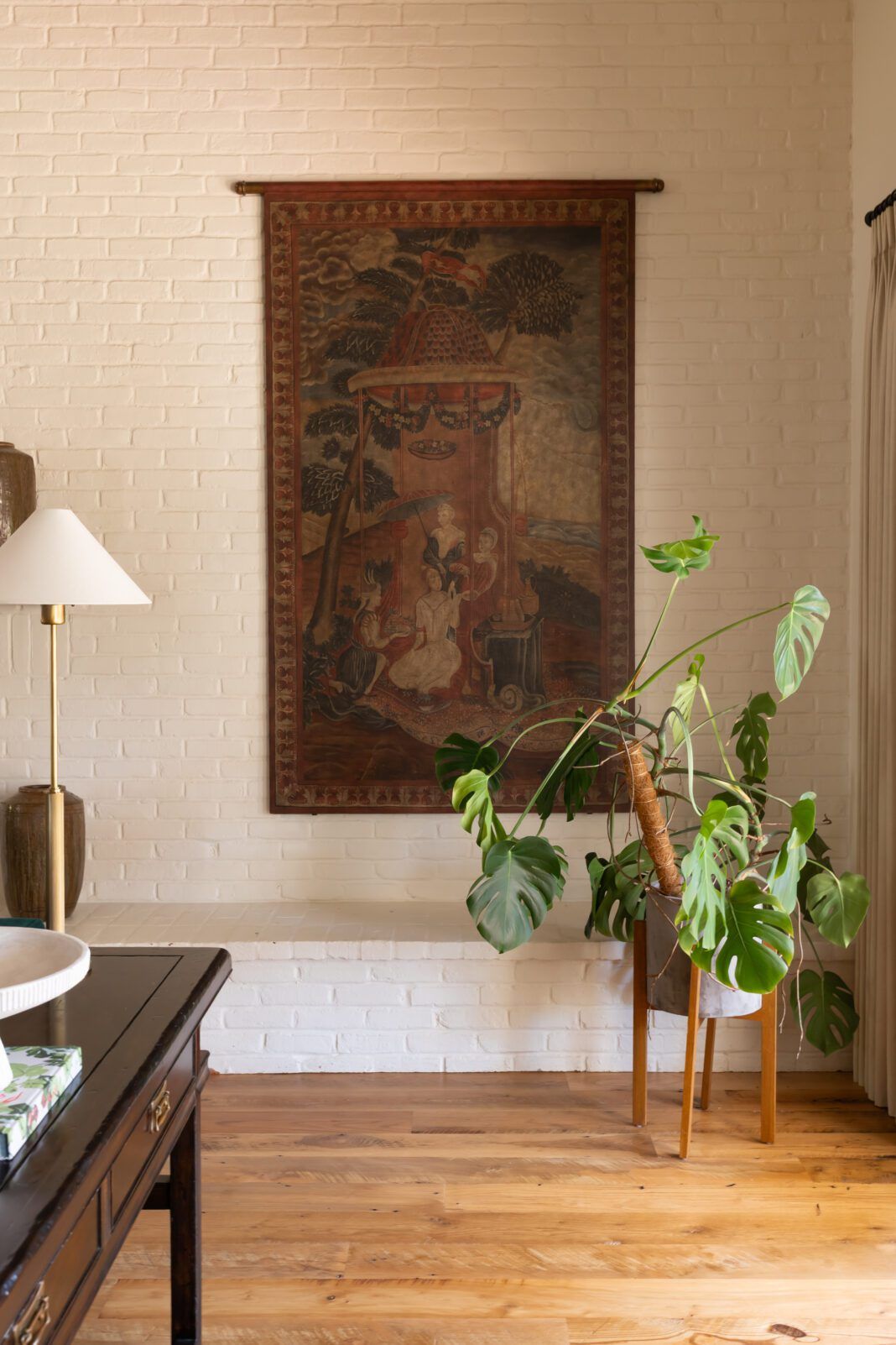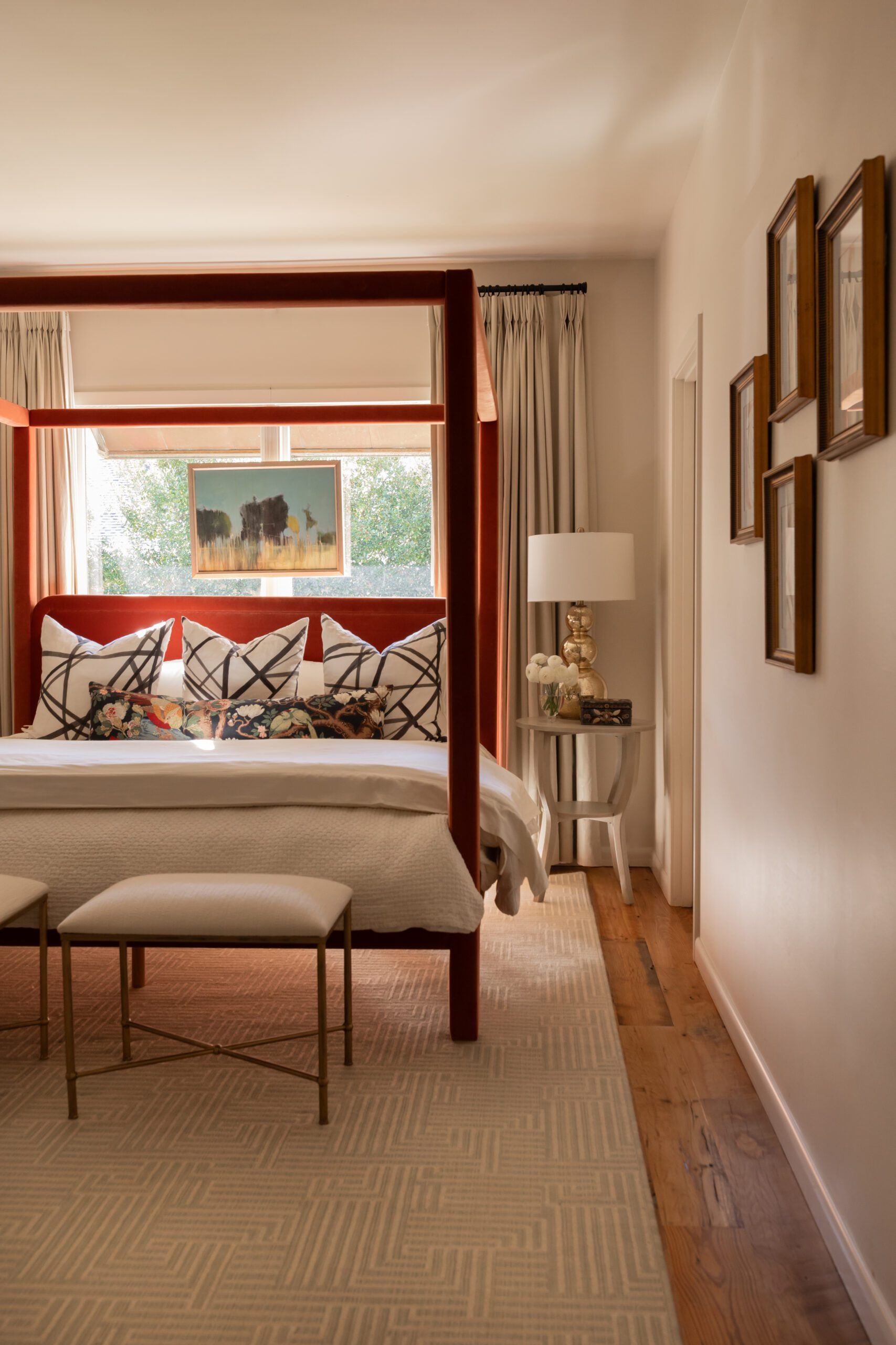 Over in the couple’s primary bedroom, Trent replaced a traditional wrought-iron bed with a chic terra cotta velvet upholstered canopy. A stitched white quilt and plush geometric pillows added to the high-end hotel vibe. Trent says the custom-made lumbar pillow, featuring an abundance of flora and fauna, was the finishing touch.
