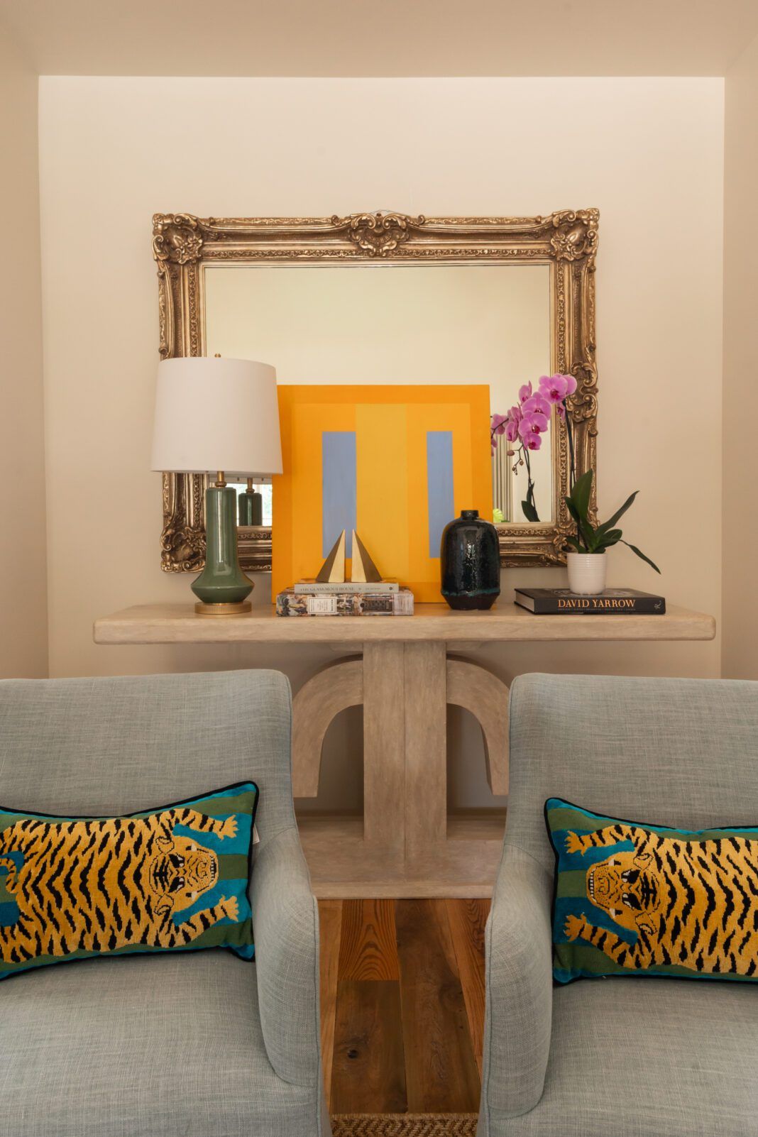 Trent pulled the room’s rich color scheme from artwork the couple already owned, including a muted old-world tapestry and a moody, impressionist cityscape. She then centered the space around a large abstract painting to give it a slightly more modern feel.