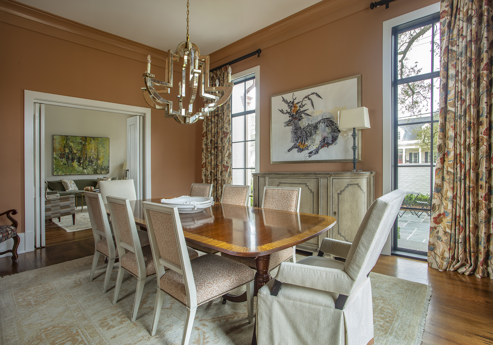When designer David Coco chose the terracotta shade that covers the walls and crown molding in the dining room of this home in the Webb Park neighborhood, he was thinking of authentic Cajun cooking—crawfish étouffée, shrimp Creole and jambalaya, all of which share a similar shade. But he was also thinking of the gatherings that so often accompany these meals, from Sunday dinners to family parties, for which the home had been designed.