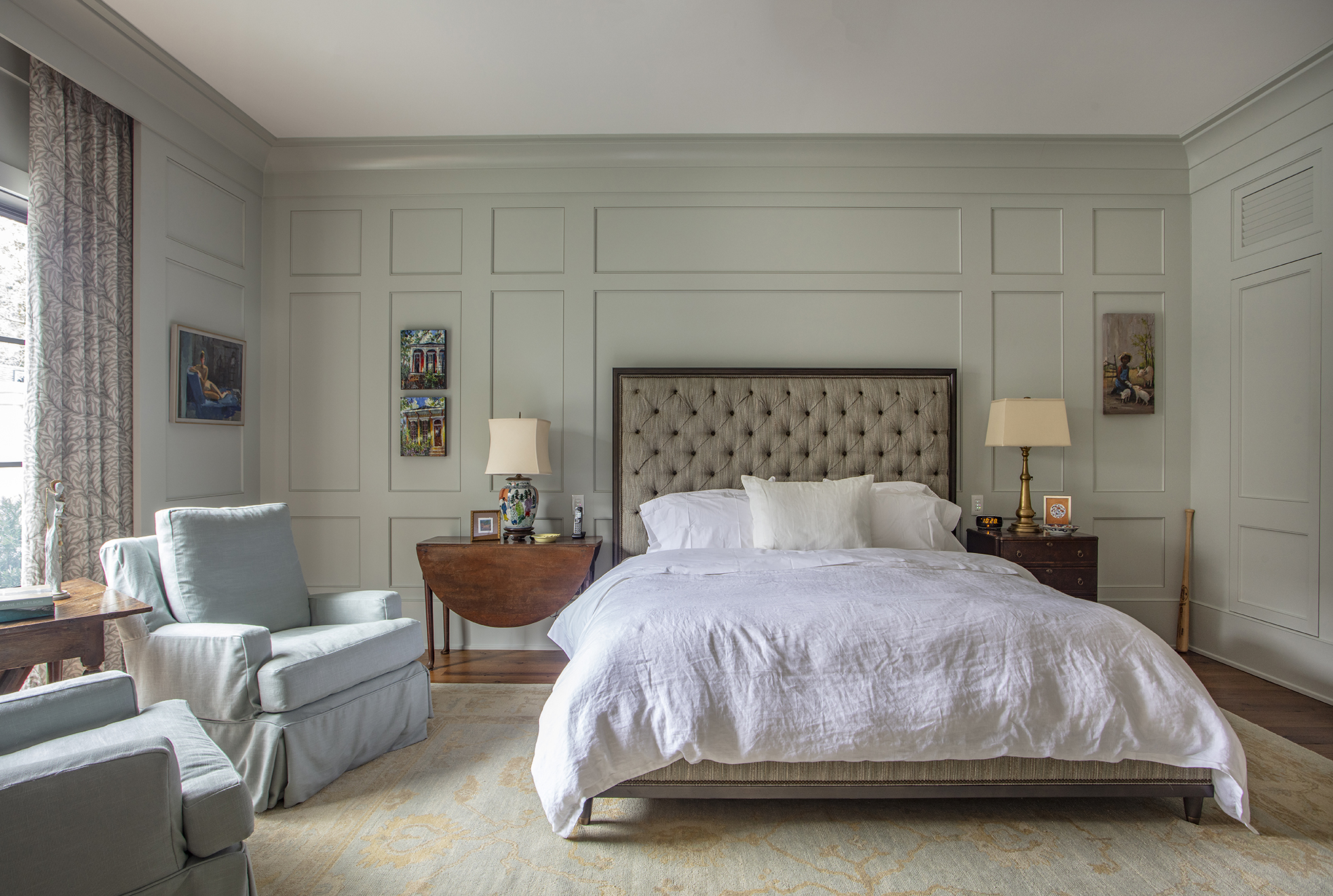 It’s the backdrop of updated and interesting colors that Coco says allows for the seamless coexistence of old and new, antique and modern. Benjamin Moore’s “Grandma’s China” covers the walls throughout the home, but pops of colors like Sherwin Williams’ “Silver Strand” in the master bedroom, Sherwin Williams’ “Unusual Gray” in the office, and, most strikingly, Sherwin Williams’ “Portrait Tone” in the dining room elevate each space. The statement hues are even carried to spaces like the home’s powder room and butler’s pantry with wallpaper in botanical patterns by William Morris.