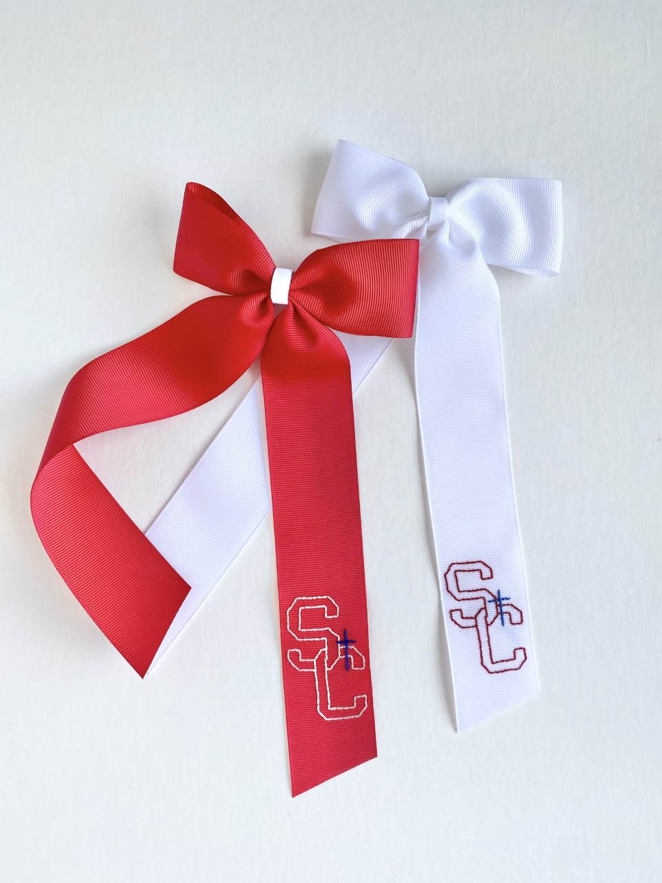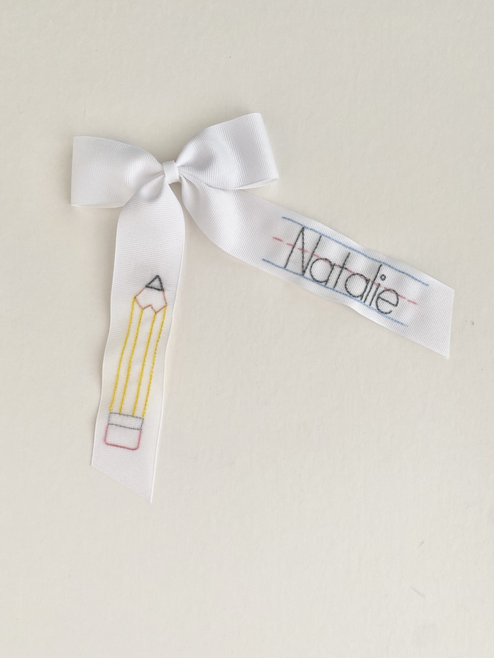 I have had a lot of fun recently making hand-embroidered bows for the back-to-school season. I make each bow by hand and then embroider a custom design on the ribbon. I also love stitching heirloom baptism gowns. It is special to embroider the names of the different generations who have all been baptized in the same piece.