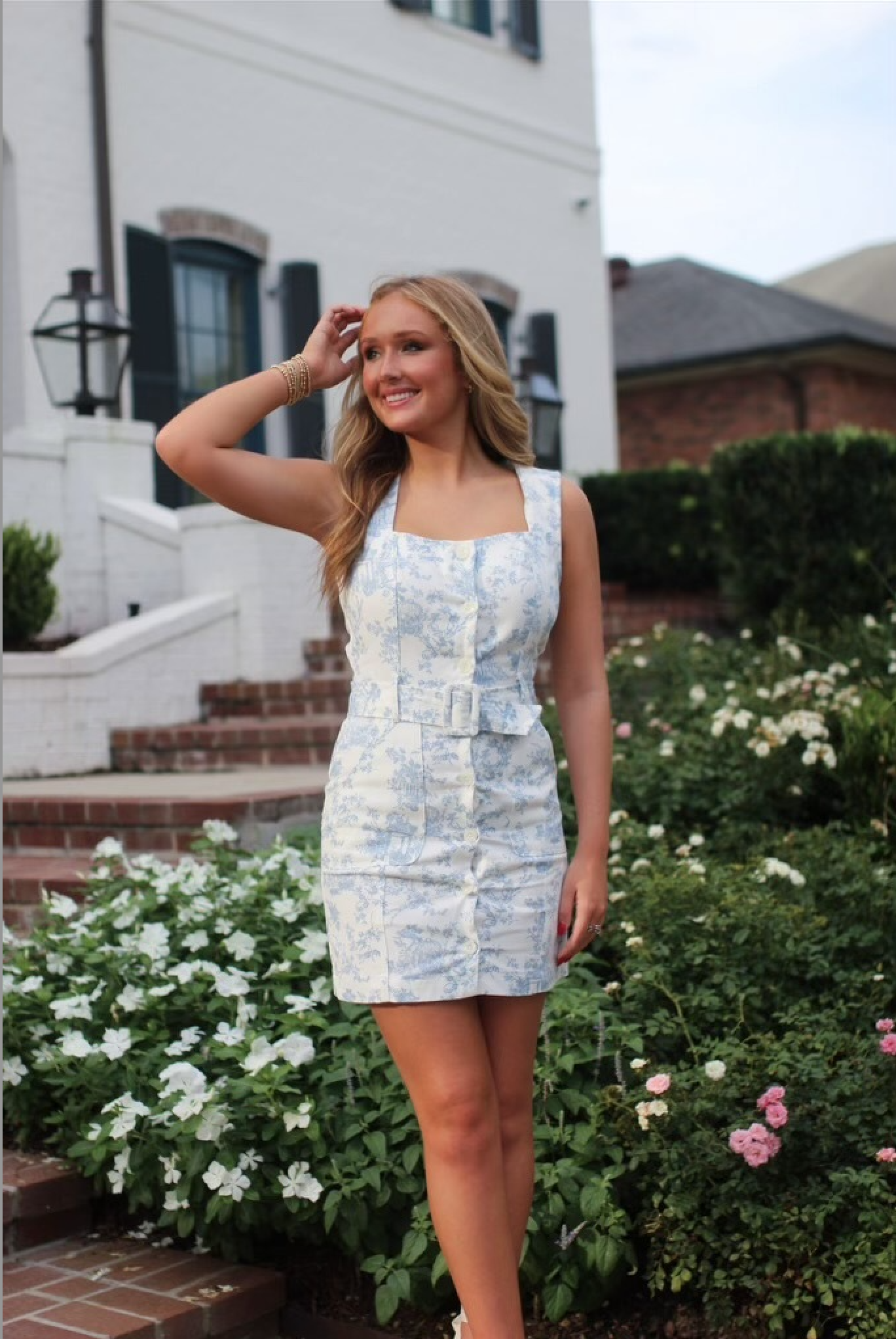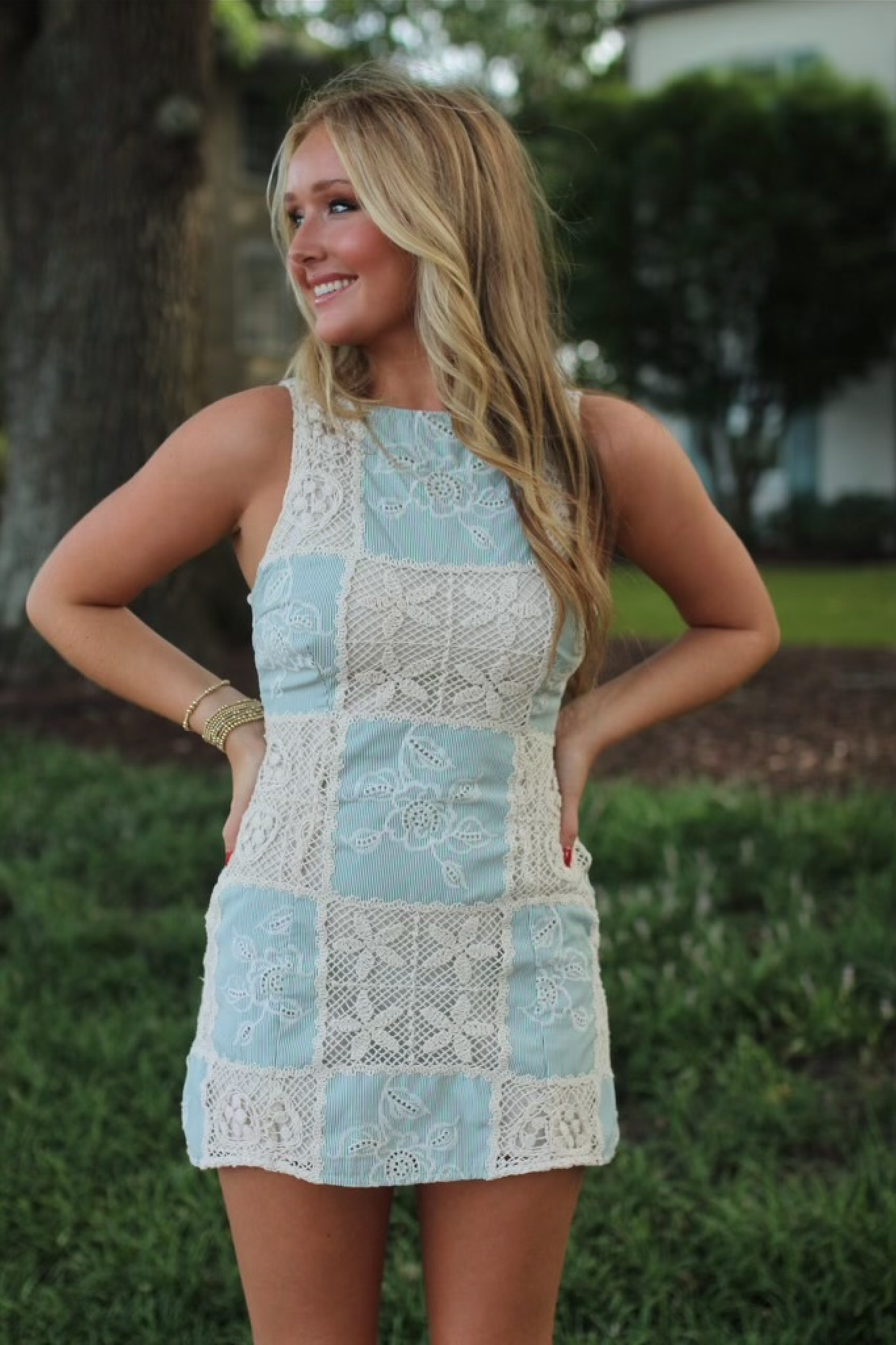 “Within the collection, there are a lot of florals, tiered dresses, ruffles and eyelet fabric which is all very in style at the moment,” Paysse says, explaining that her favorites are the Camille crochet green mini dress and the Francesca French toile blue dress, both pictured below.