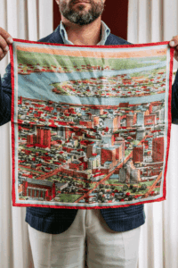 “The vintage postcards we chose feature more off-the-beaten-path imagery, like Pontchartrain Beach and the Rex parade going down Canal.” Kristen says of the scarves designed in-house with help from Sonny Mitchell, and handmade in a small workshop in Italy, where they also craft the brand’s ties.