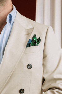 “Sonny was a big help with choosing the colors on the borders,” James says. “In the suiting world, the border is the most important part because it’s the part that shows when it’s folded up and worn as an actual pocket square.”