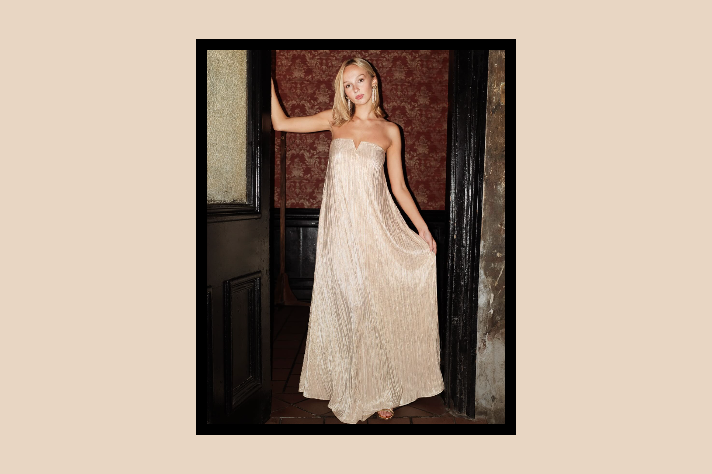 If you are looking for something a little more dressy, this golden gown is a simple yet chic option that will have you shining at any upscale event.