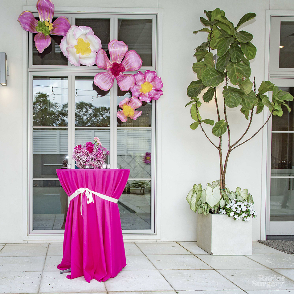 The theme was carried to every detail of the event, which was hosted by more than 40 couples and friends. Rose lemonade-flavored popsicles chilled cocktails for guests upon arrival, and pink-tinted baby’s breath was scattered throughout the pool and patio area.