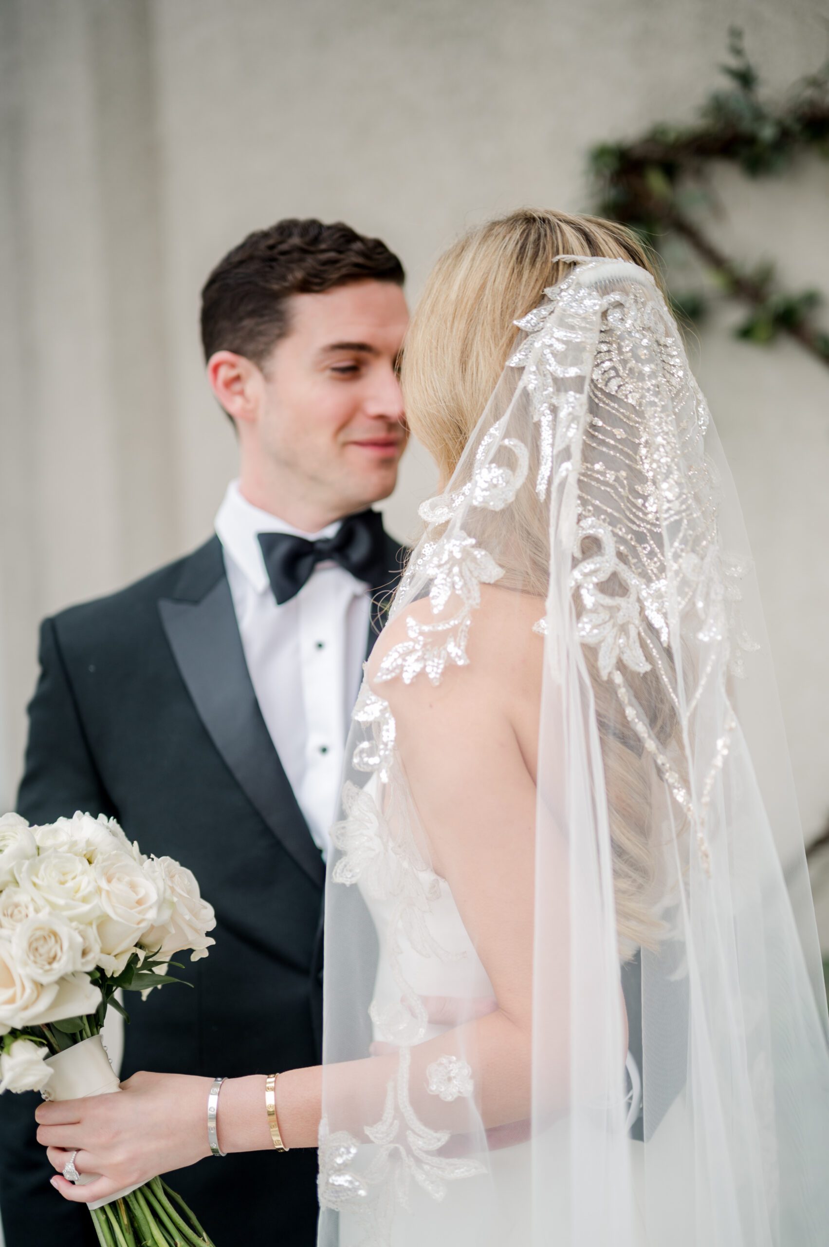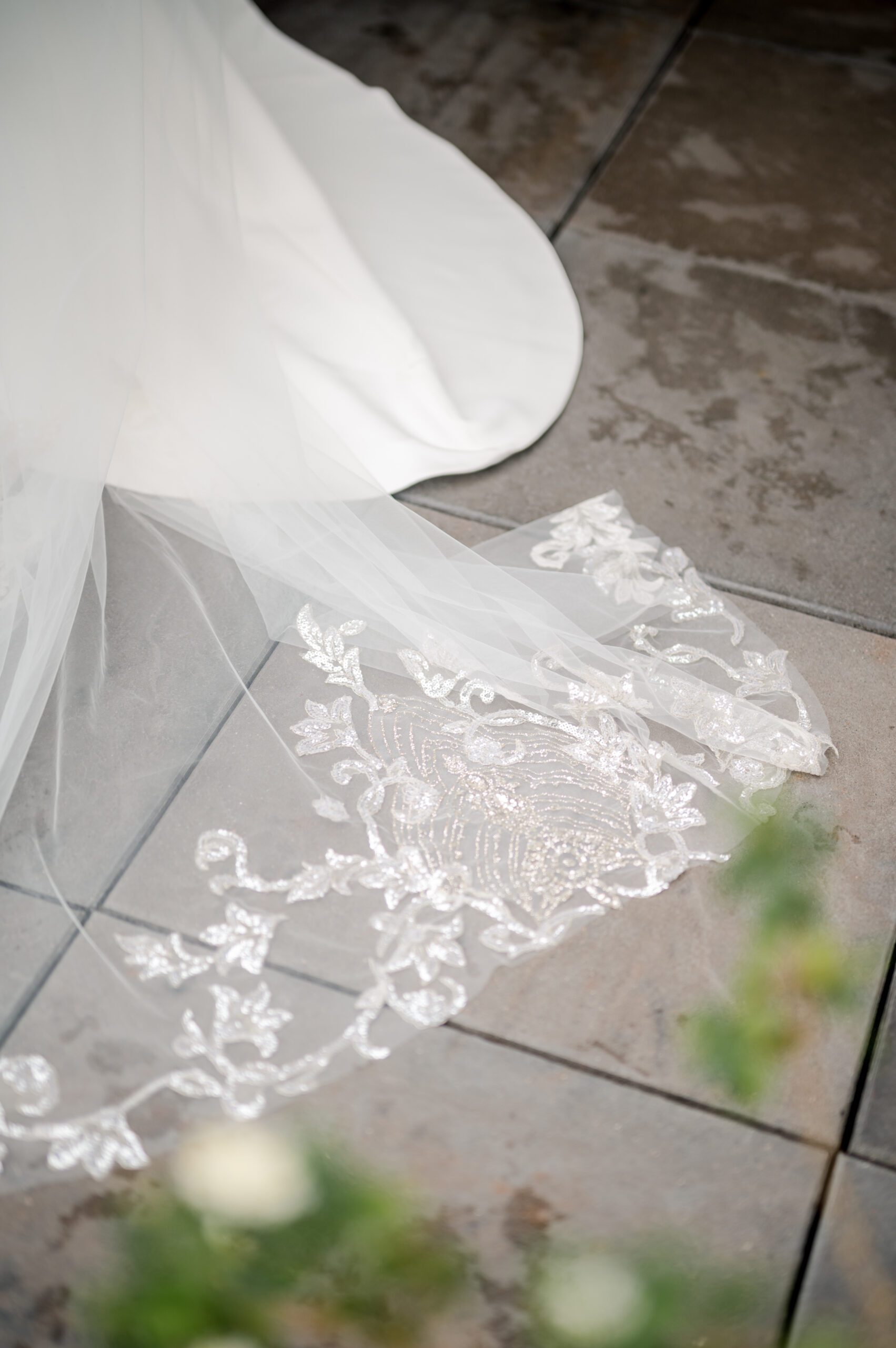 The veil’s intricate beading was a fitting precursor to the glitz that would follow at the reception, while also giving a nod to the relationships she built during her bridal season.