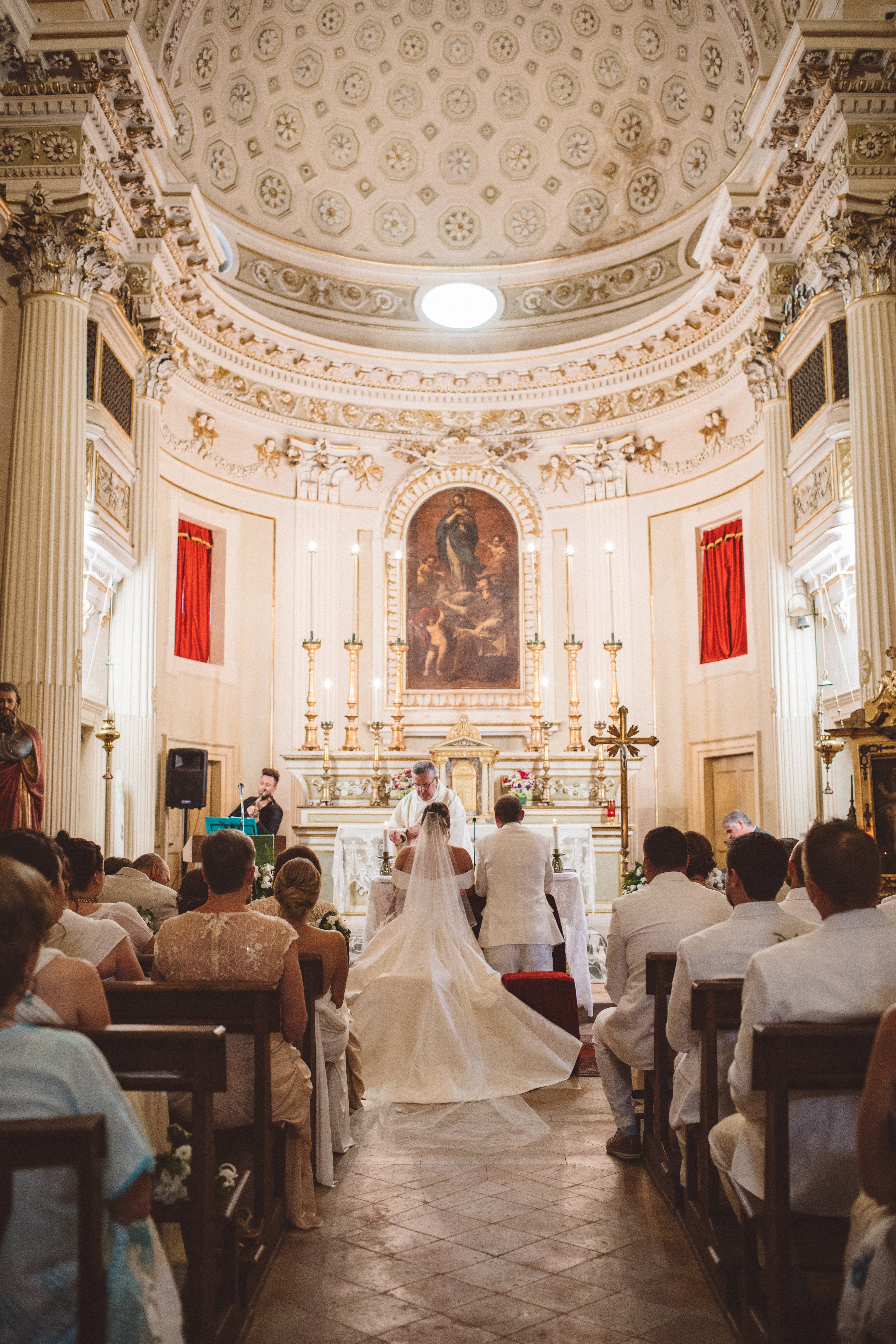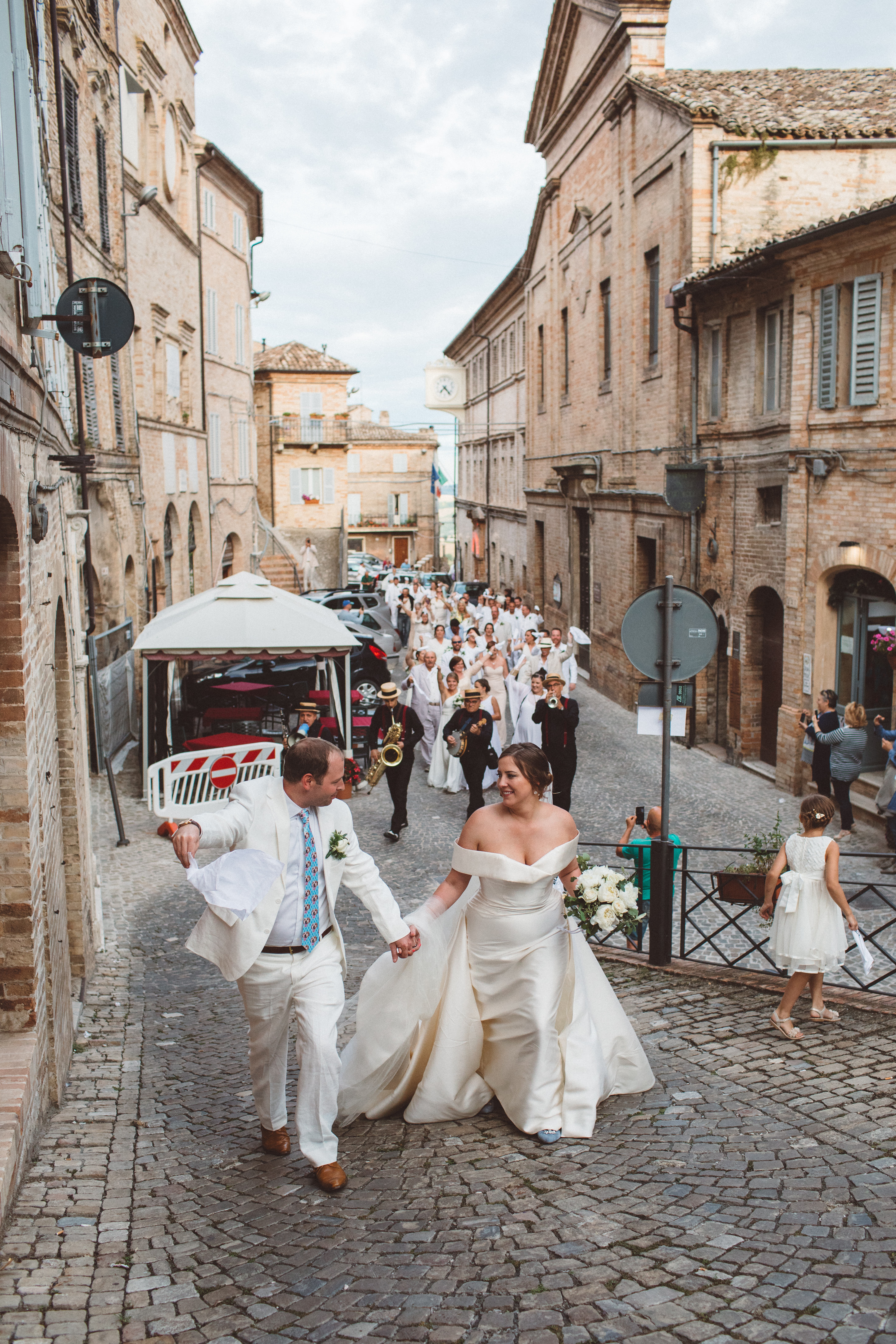 It was a weeklong celebration at the Palazzo Mannocchi in Petritoli, Italy, for Kathryn Juneau and James Maddi. The festivities included dinner in the town castle, wine tasting at a local vineyard, nuptials in a medieval Catholic church with violin and trumpet music during the ceremony, along with a second line band (from Italy) playing New Orleans jazz music to walk guests to the reception. “Our wedding party wore white, and we kept the décor simple to allow the setting of the small town to speak for itself,” says Kathryn. Serving only local wine at the reception, the couple ended the evening with their 60 guests dancing until sunrise in the castle’s dungeon. Photos by Paolo Ceritano.