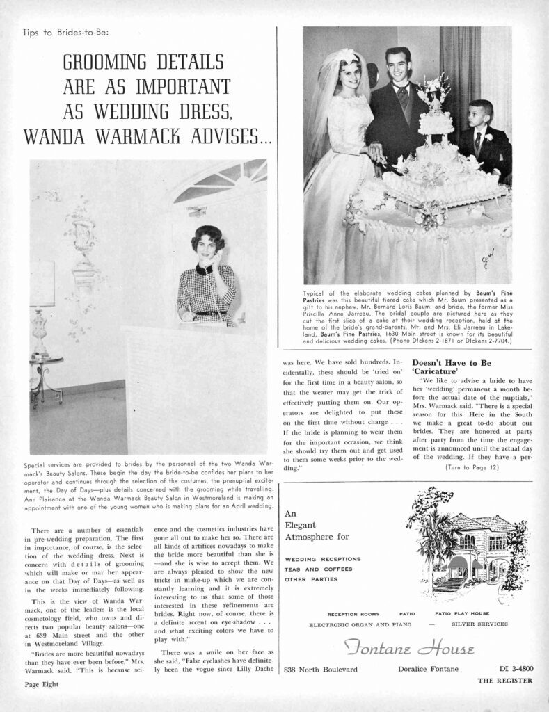 It’s no secret that every “big day” has a common centerpiece: the dress. With many young girls searching for their preferred style long before a potential husband comes along, it’s the first thing on most wedding planning to-do lists. In the February 1962 issue of inRegister predecessor The Register, local salon owner Wanda Warmack acknowledges this sentiment. Something she stresses is the importance of smaller details and “grooming” to tie the special look together. Although trends in these subtleties are ever-evolving, Warmack explains they are key for brides who want “the unusual and the spectacular.”