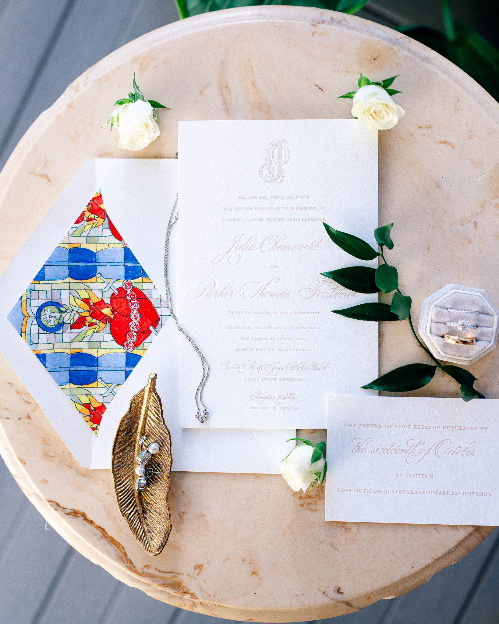 Thoughtful details were at the heart of the celebration, with things like the wedding invitation envelope liner, which featured the immaculate heart of Mary in a nod to a stained-glass window dedicated to Julia’s grandmother, who passed away in 2022, as well as more lighthearted aspects like a “mountain” of king cake—the only cake Parker likes—which included miniatures of the couple skiing, as well as ski lift.
