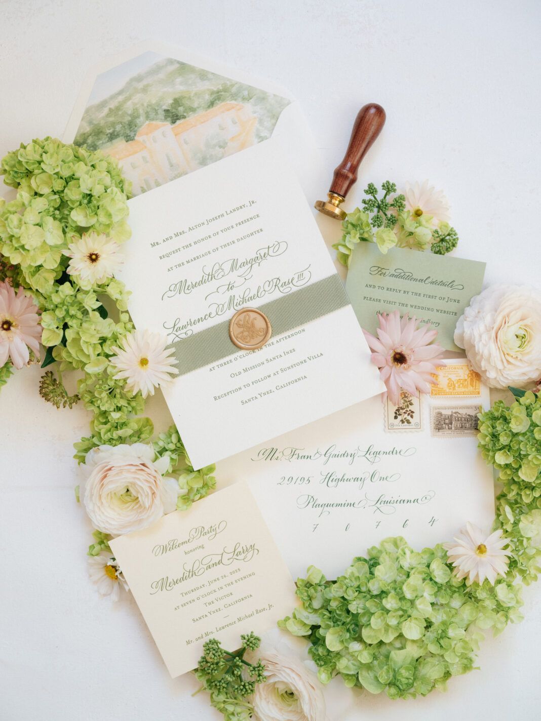 Though they wed under a greenery-draped pergola and celebrated with a reception in a winery that felt like a Tuscan villa, Meredith and Larry brought pieces of Louisiana with them. Vendors received baskets filled with Tony Chachere’s, Café du Monde beignet mix, and sugar from Meredith’s family’s sugarcane farm. Sidecar Cocktail Co. crafted signature drinks, the Remy-rita and Coop’s Old Fashioned, honoring the couple’s beloved dogs. Of course, homage was paid to LSU. Death Valley made its way to the Santa Ynez Valley in the form of a groom’s cake shaped like Tiger Stadium, courtesy of Autumn Cakes. It was just enough to keep a little bayou by them.