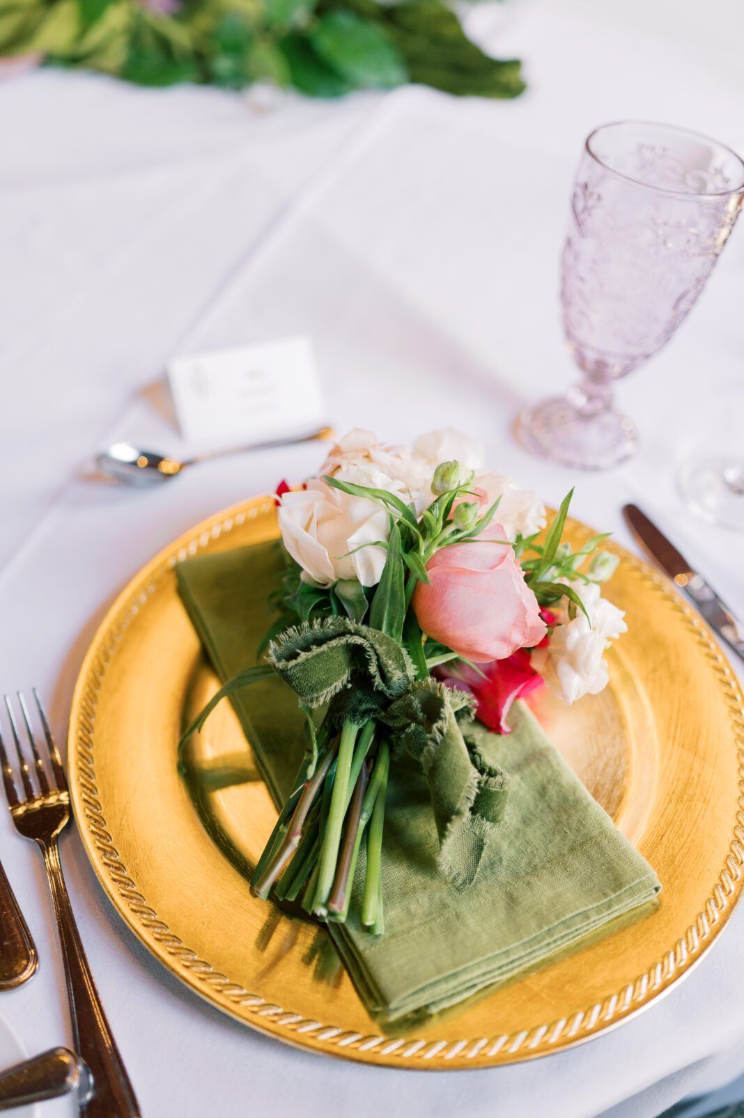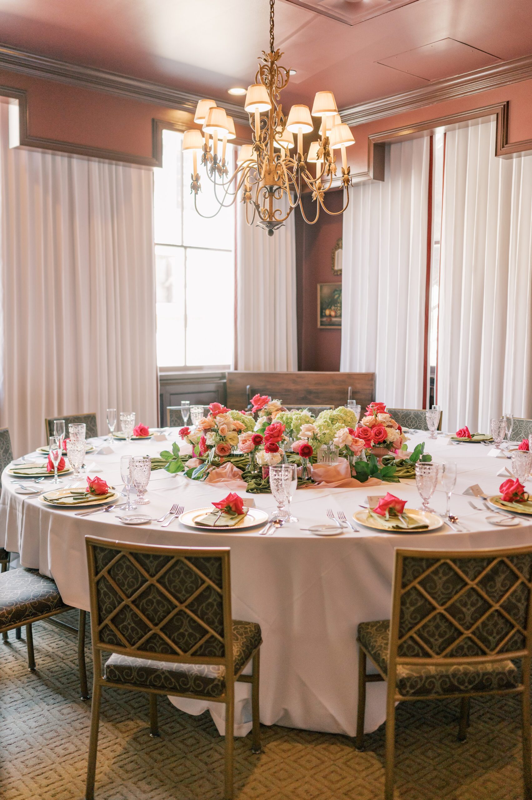 The striking floral arrangements complemented guests’ attire, which boasted every shade of pink at the request of the bride. And gilded chargers atop blush tablecloths completed the vision.