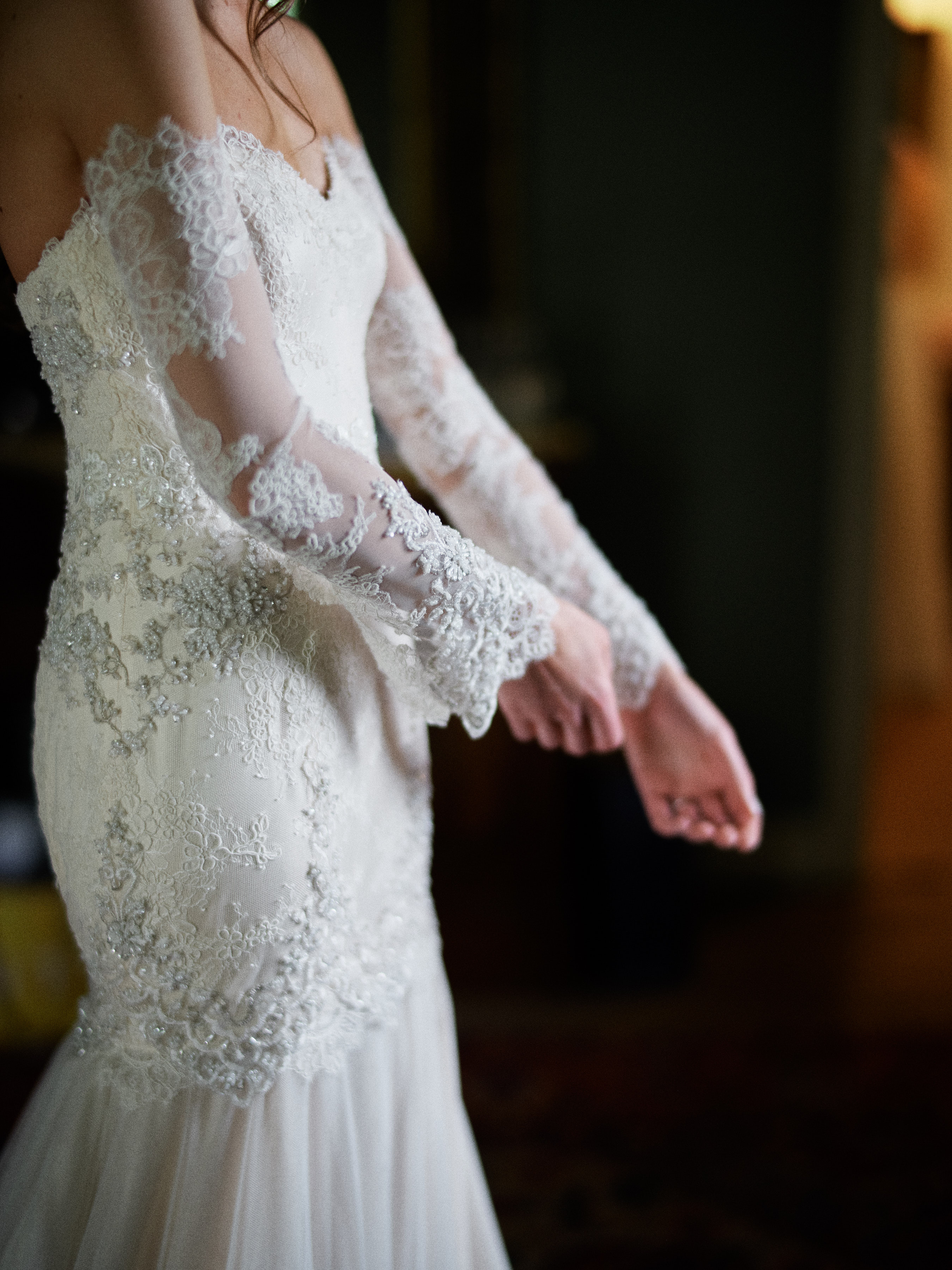 “The general idea for my wedding gown had been tucked back in my mind for at least a decade prior to our engagement,” Palfrey says. “I knew that I wanted my dress to have romantic lace details, a slim bodice and a flowing train. I also loved the idea of a sleeve detail that left my shoulders exposed.”