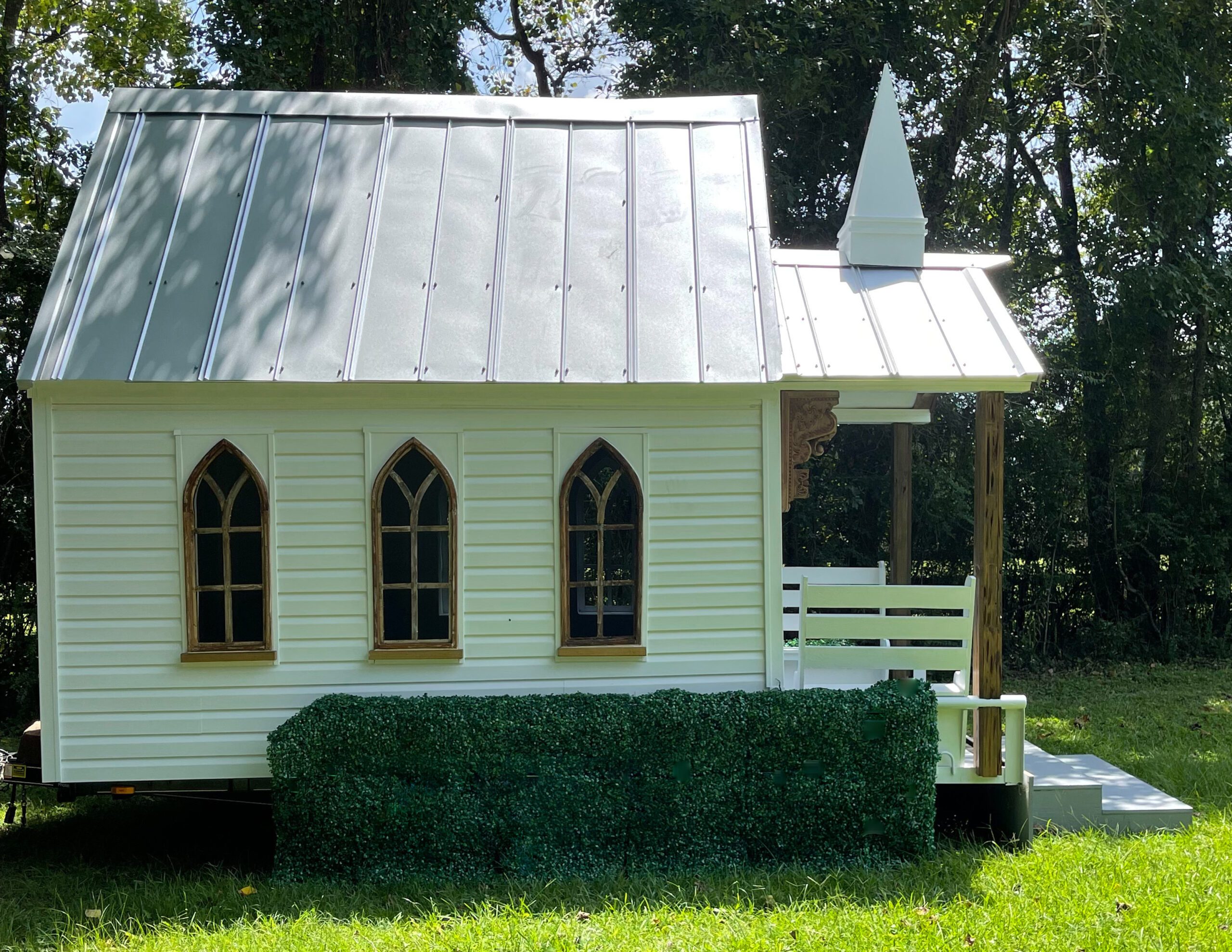 “When I was searching the mobile chapel idea, I actually discovered some of my favorite examples in Australia,” says Moody. “I knew that I wanted to bring in a bunch of different design elements, but I’d say that one of the things I like about ours is the exposed wood in the ceiling, and the wooden details outside. I feel like that fits us here in Louisiana a little bit better.”