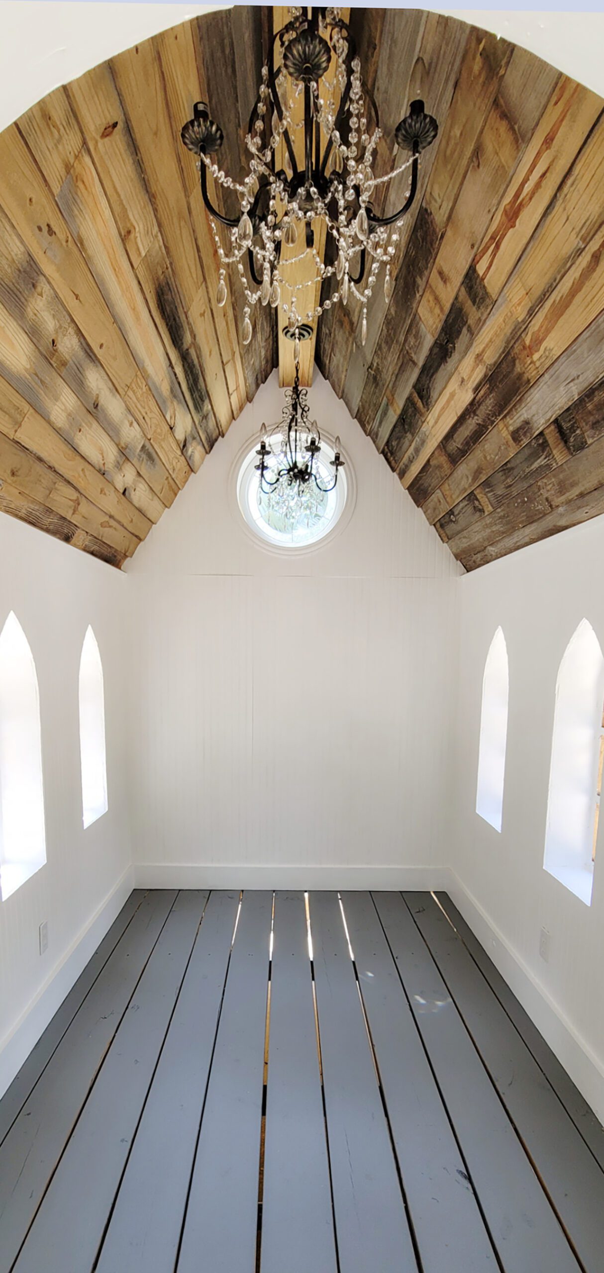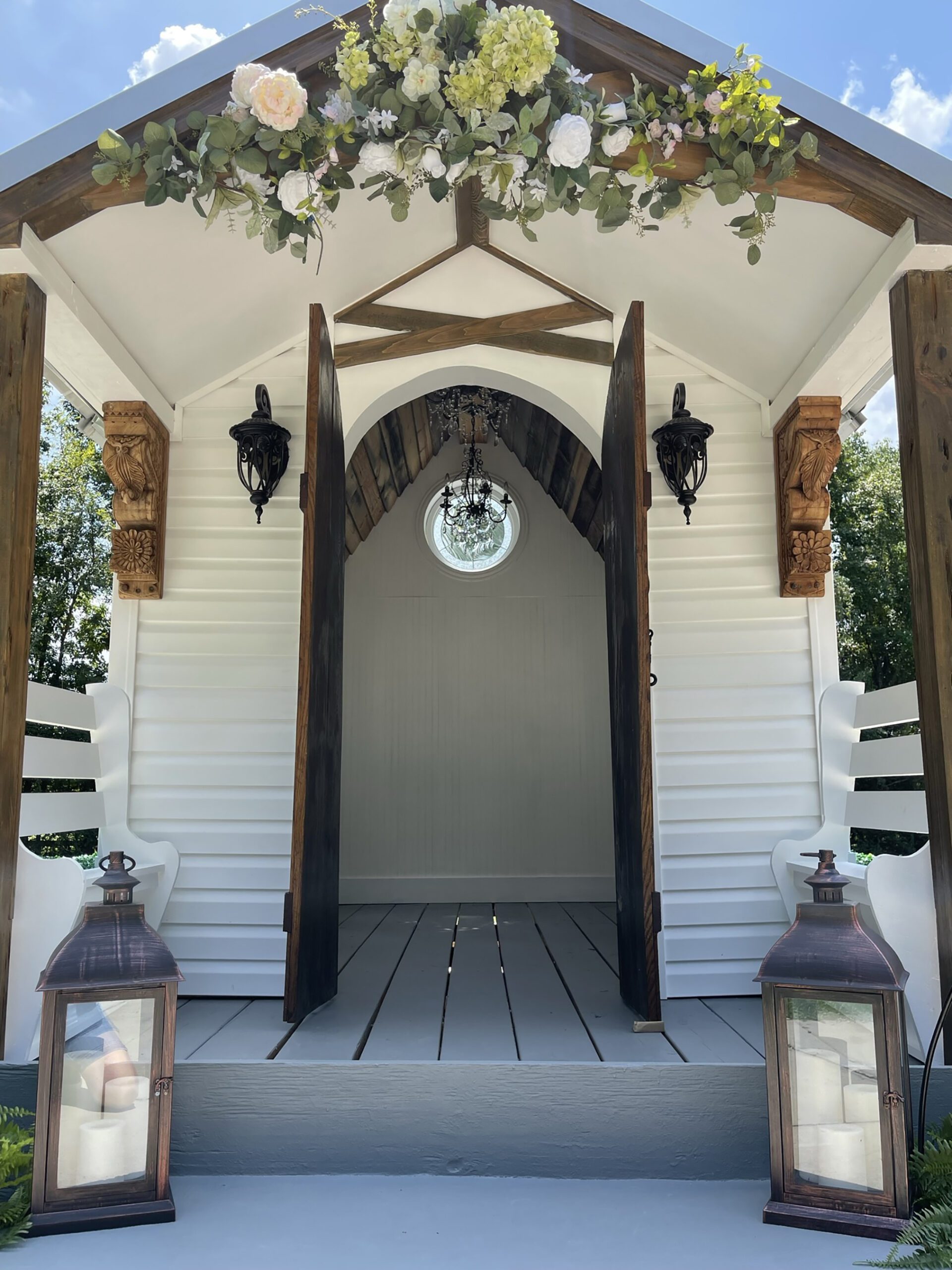 When building the little white structure—which can actually fit up to 10 people inside—Moody and her father also wanted to continue the business’ tradition of using reclaimed and recycled materials, maintaining a mission of sustainability. The chapel’s design, too, was inspired by existing structures, with Moody and her father gleaning inspiration from chapels around the world.