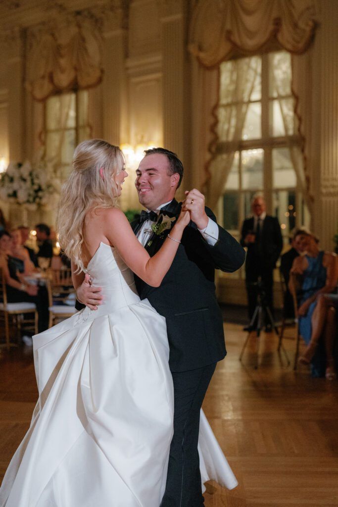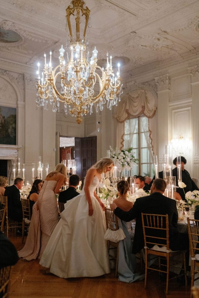 The mansion’s main ballroom was the center of the Leindecker celebration. The couple’s about 100 guests were seated for dinner in the space, and Madelyn made a second impression by debuting a half-up hairstyle and a new look for her dress, which was now without the long-sleeve, lace jacket she had worn for the ceremony.