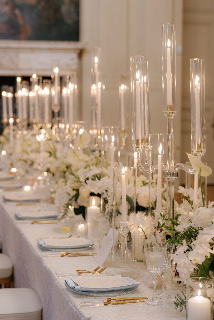 “We always draw inspiration from the bride’s dress into our design process. It reveals so much about a bride and her vision for her wedding day,” Tiffany says. “We layered heavy candlelight onto romantic, textured linens to soften and contrast the ballroom’s strong architectural lines. Oversized florals in modern shapes kept the design properly scaled. The wedding cake had a modern design that mirrored both the lace and lines of her dress. Everything added impact without competing with the ballroom.”