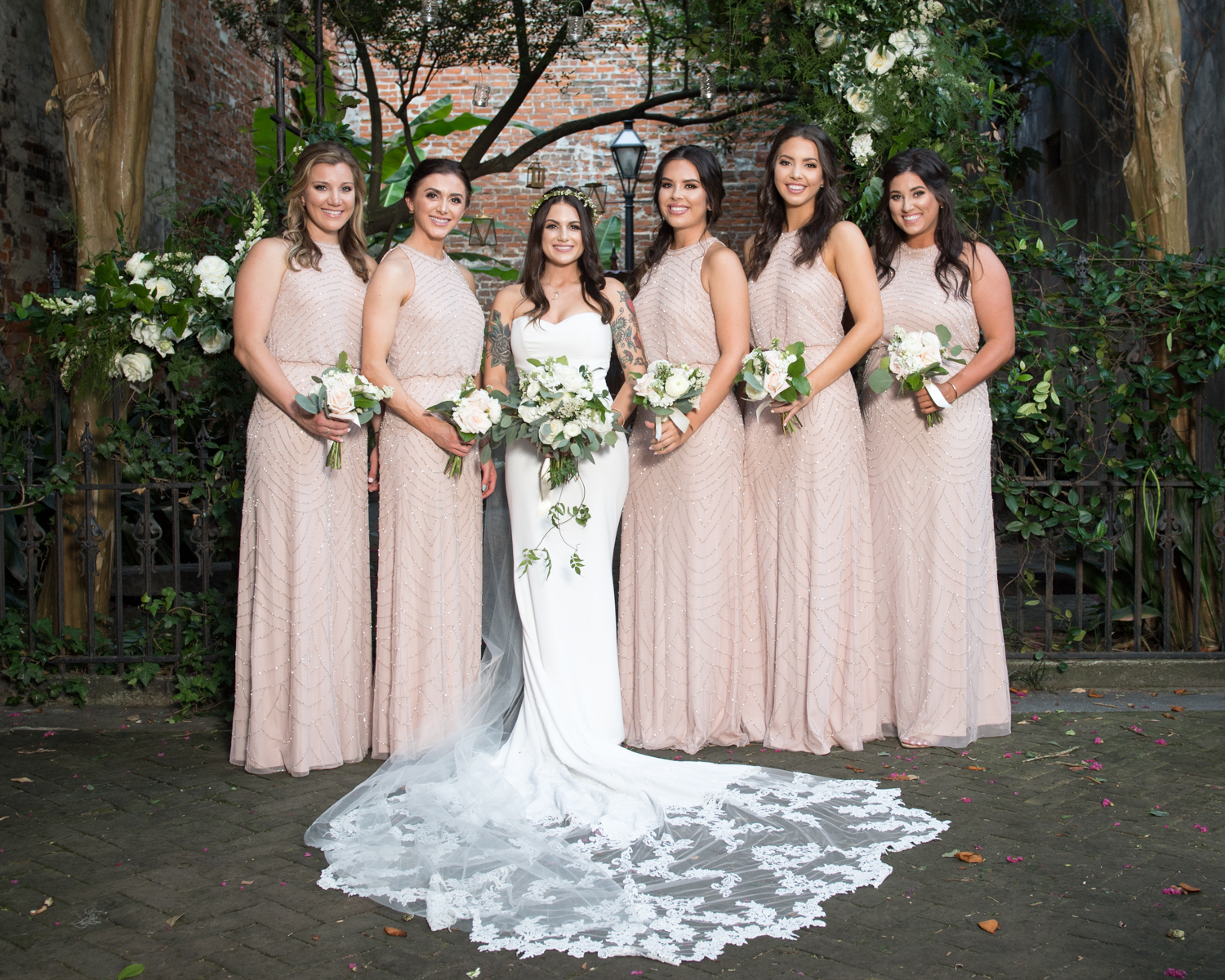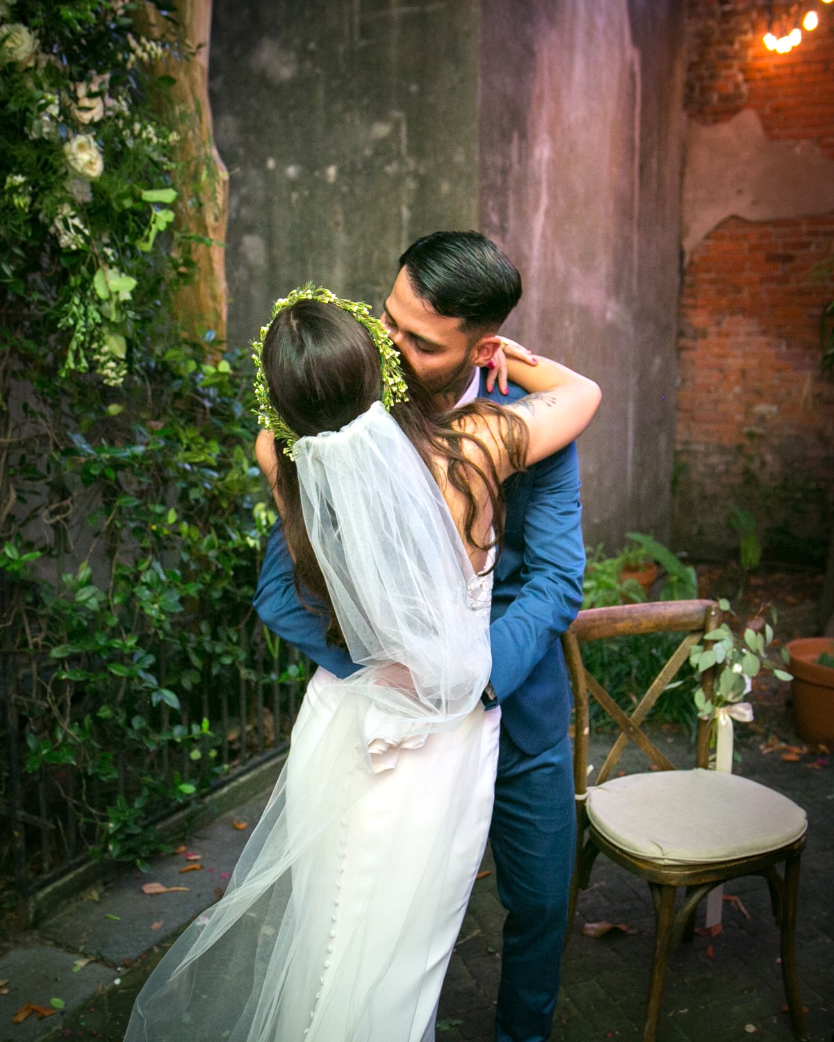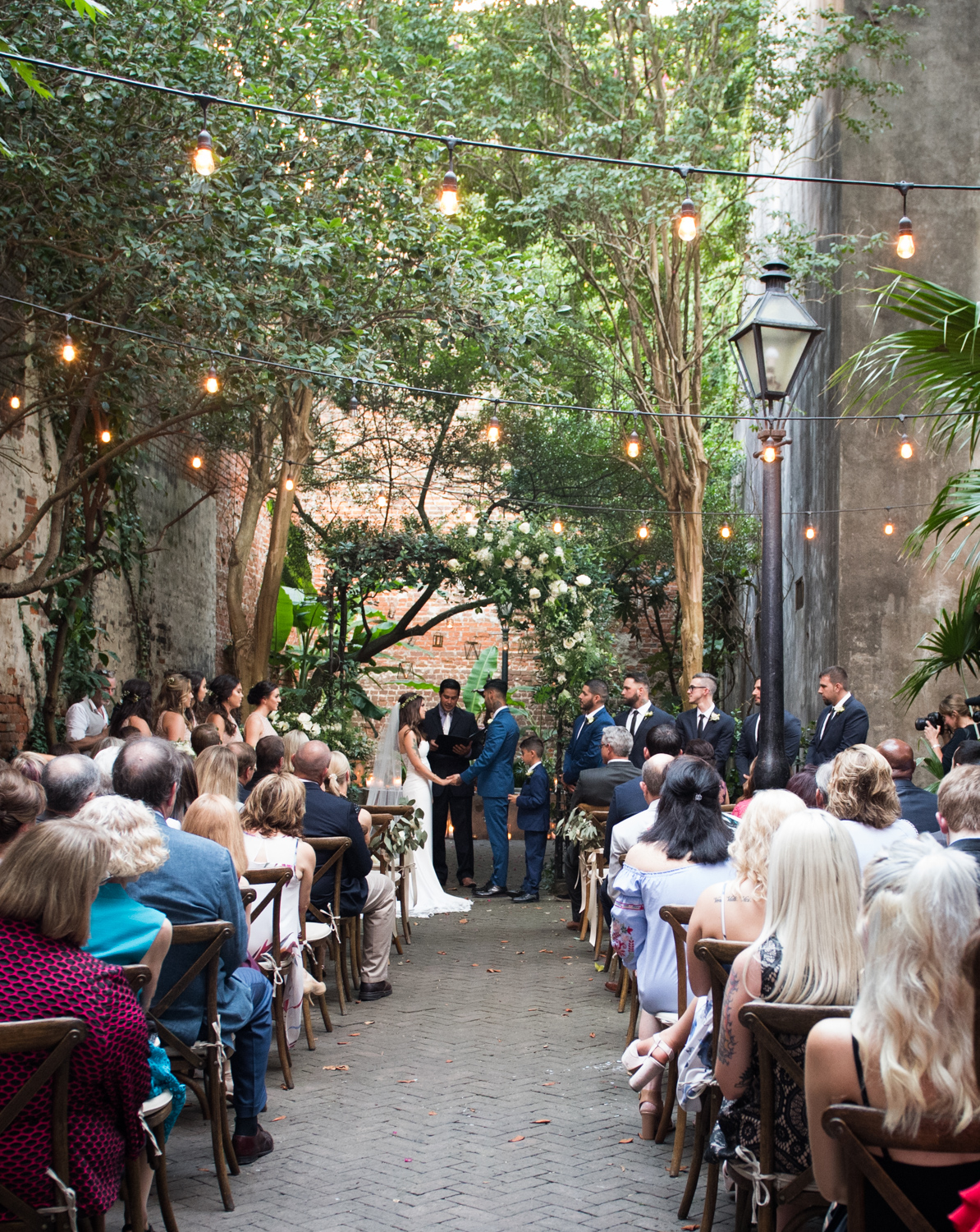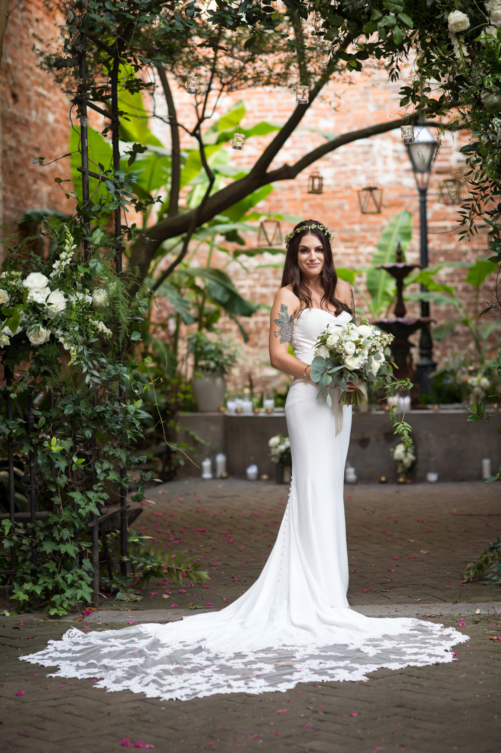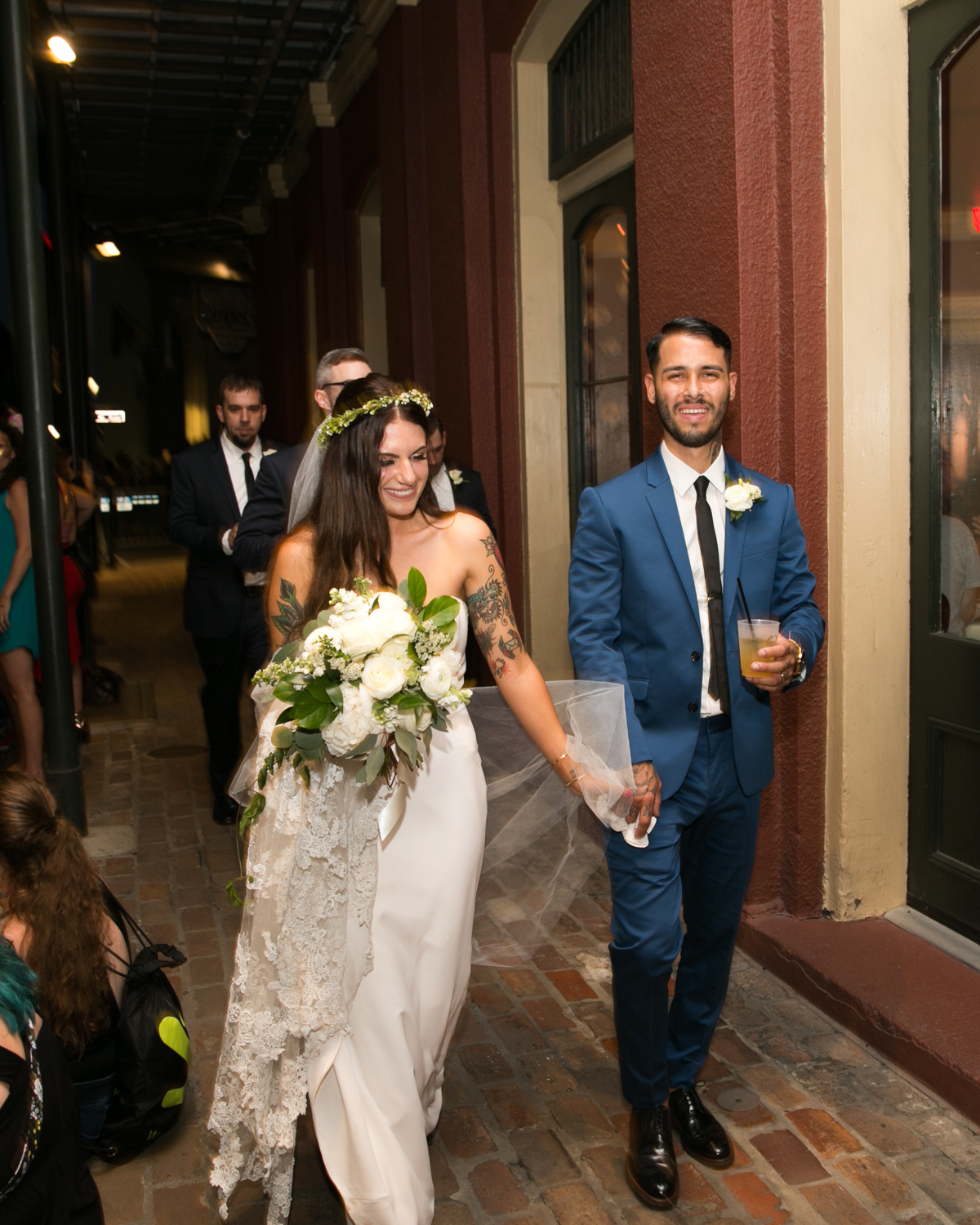 “We chose the New Orleans Pharmacy Museum for our ceremony and Muriel’s in Jackson Square for our reception because both venues are a great mixture of traditional and eclectic, just like us,” explains Gabrielle. “The elegance of a courtyard ceremony set within the oddity of the museum was such a perfect harmony of our personalities. And, Muriel’s is so stylish, with an ambiance that is romantic and haunting. We’re both bookworms and loved the history behind our venue choices. The spaces were intimate enough to savor the little moments, but roomy enough for everyone to move around and enjoy themselves.”