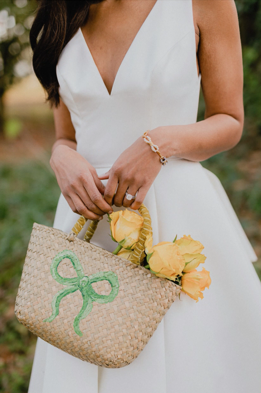 “I was inspired by the straw bag trend for this shoot, and I thought the bow detail you see on the one we used was a cute way to bring in the trend while still keeping the style looking different and individual,” says Babin. “Even the monogram on the stationery is a very Southern-inspired touch, but the bow detail is an unexpected embellishment to just make it extra pretty.”