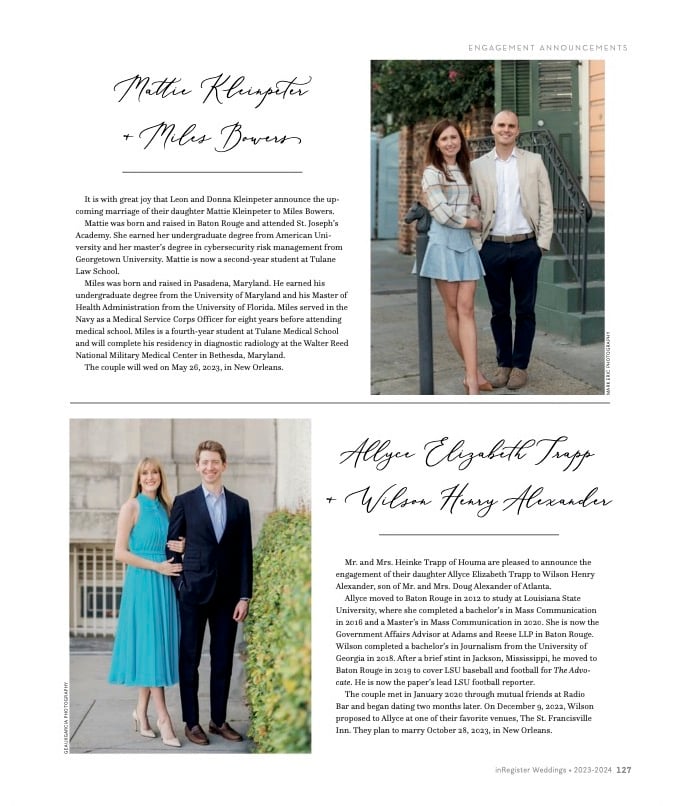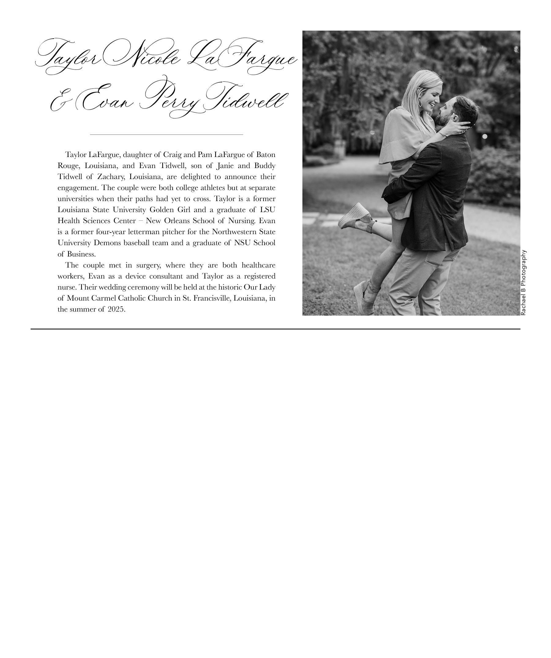 A Paid Engagement Announcement lets newly engaged couples share their happy news with the Baton Rouge community. Each half-page announcement includes one vertical photo and a short write-up.