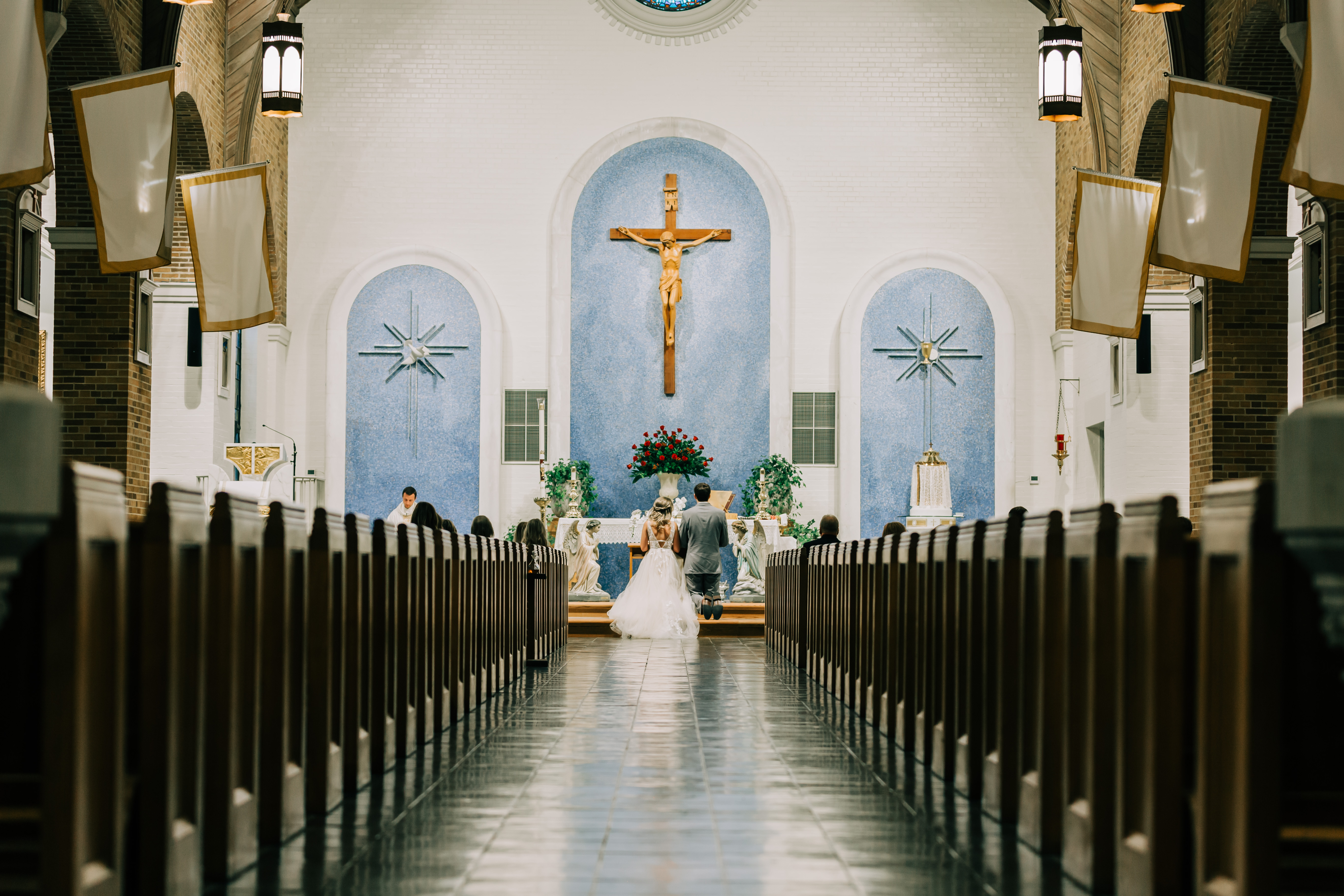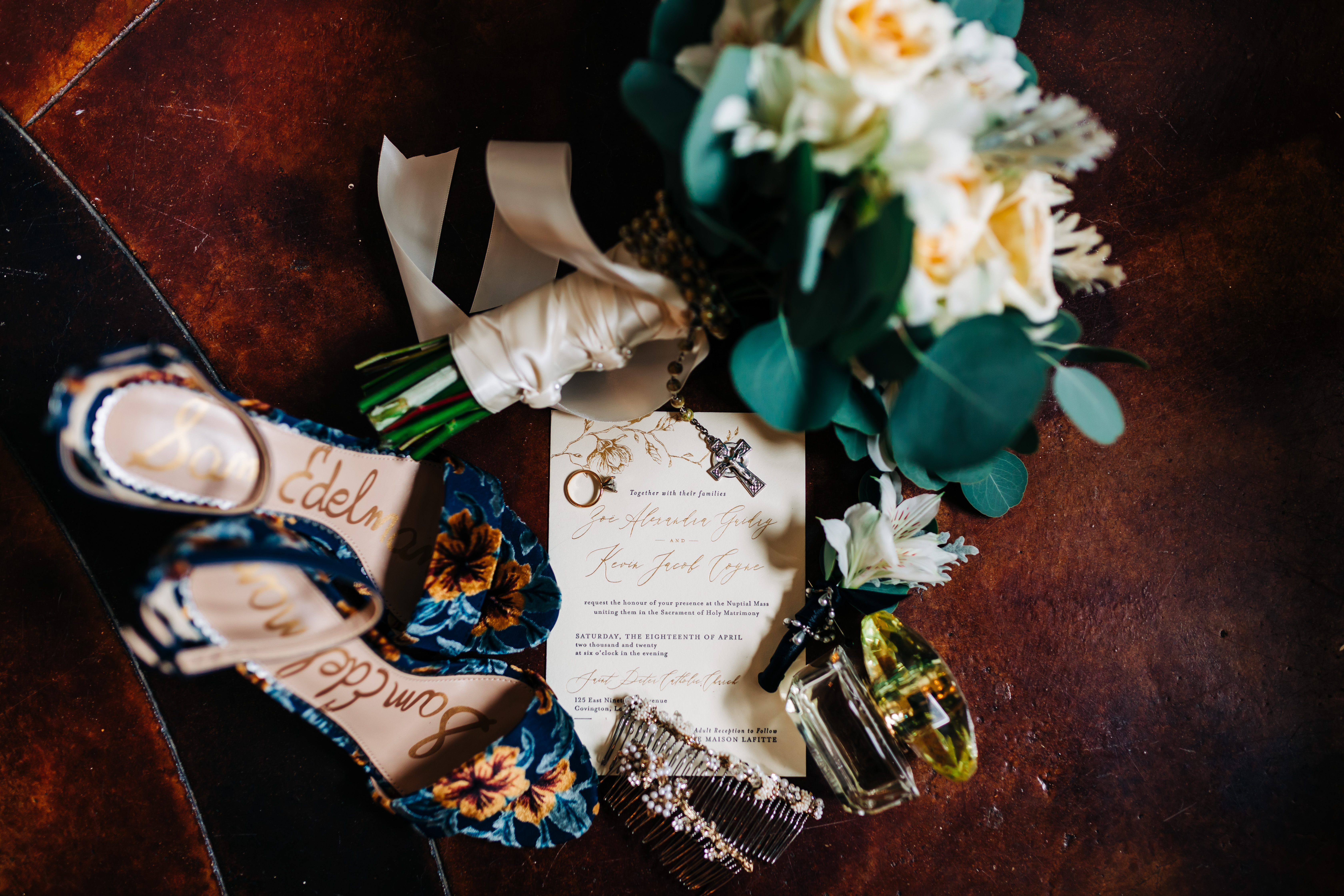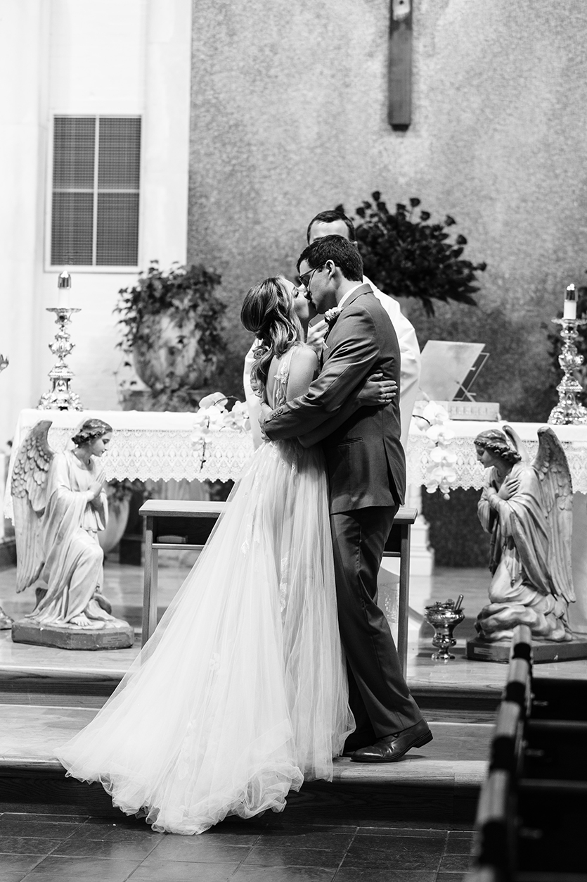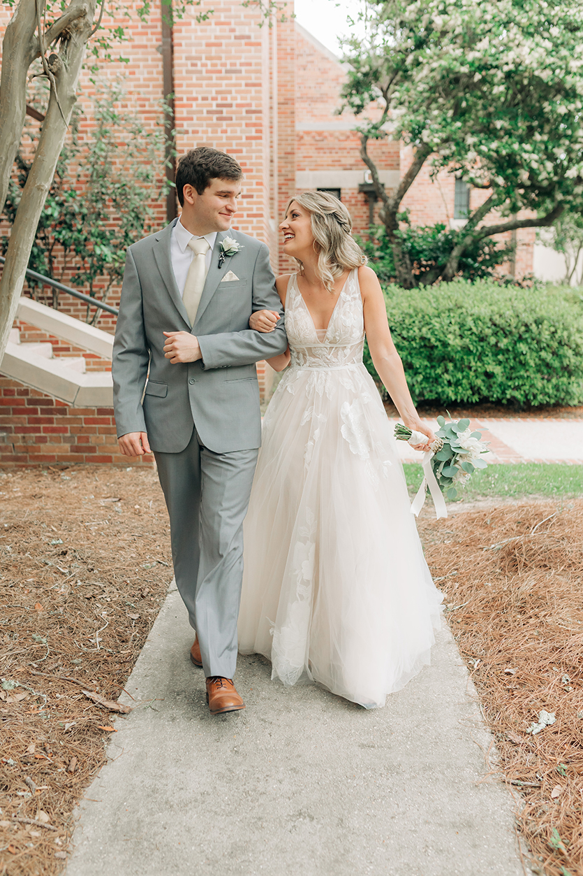 “Our wedding was a beautiful, intimate ceremony at St. Peter Catholic Church in Covington,” explains Zoë. “We were allowed 10 people at the ceremony, so we only had immediate family in the church. Our parents’ friends were nice enough to host a socially distanced reception at their home down the street right after the mass. We laughed, we cried, we danced. It was a beautiful day!”
