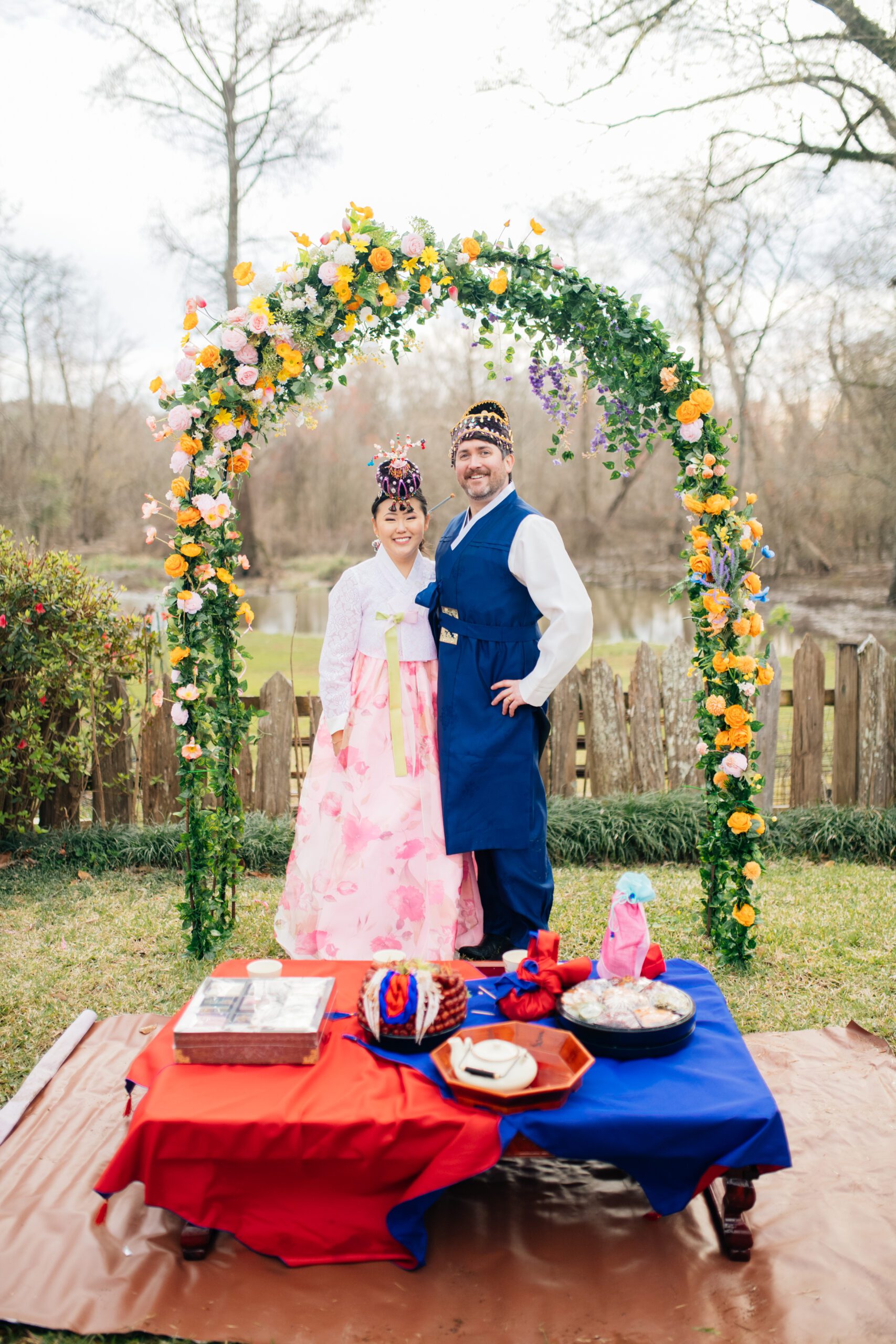 “Traditionally on the wedding day, the bride and groom wear elaborate hanboks in bright red and blue colors, with draping fabrics and various accessories,” Kim says. “Hanbok is the traditional attire of the Korean people but nowadays, it is only worn as formal wear on special occasions. For our ceremony, we chose simplistic Korean hanboks that suited our personal styles. My father handcrafted the headwear to accompany the outfits, which was a special touch.”